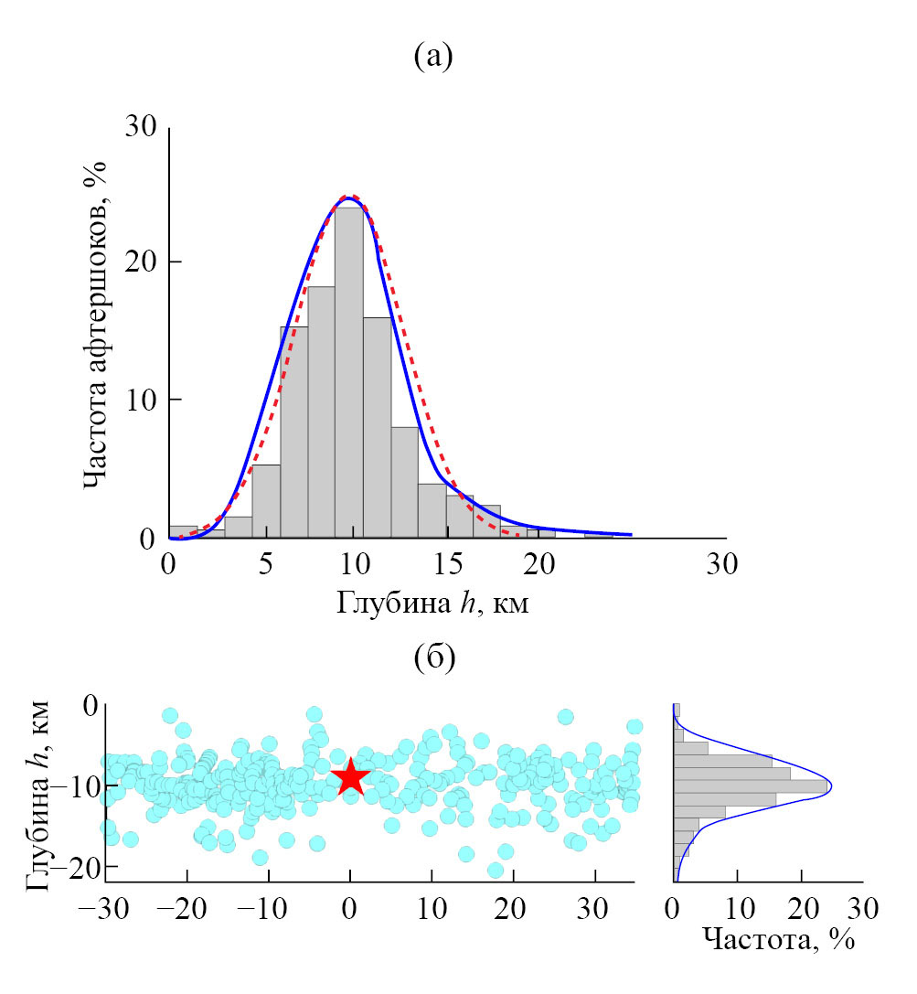 Рис. 3. Афтершоки землетрясения Акетао по данным [8]. а – график распределения афтершоков по глубине (красная пунктирная линия – функция Гаусса (1), при заданных параметрах h0 = 10 км; b = 3 км; A = 1); б – распределение афтершоков по глубине вдоль разрыва.