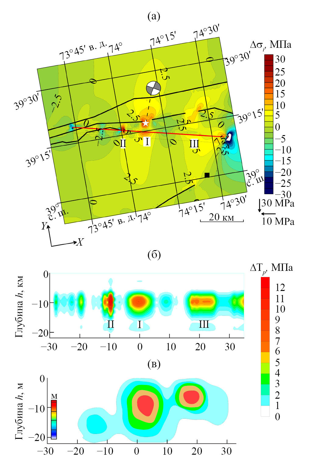 Рис. 4. Напряженно-деформированное состояние разрыва. а – карта разности напряжений ∆σi до и после землетрясения (сброс напряжений); б – сброшенные напряжения ∆τр вдоль поверхности разлома после применения функции (2); в – модель косейсмических смещений, полученной в результате инверсии данных InSAR [8].