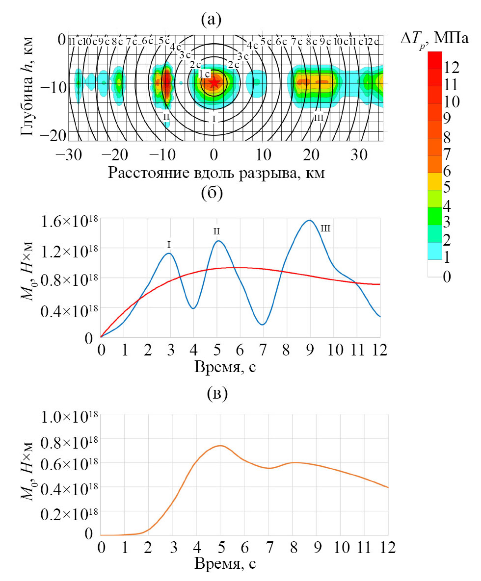 Временная функция сейсмического момента имеет три экстремума в начале графика, соответствующие интервалам максимальной энергии сейсмических волн. При этом следует отметить то, что в работе [8] зафиксировано двойное ударное воздействие при землетрясении Акетао (рис. 4 в), соответствующее экстремумам I–II (рис. 5 б). Временная функция сейсмического момента, представленная на рис. 5 б имеет три экстремума, соответствующих во времени пересечению разрывом зон высокой интенсивности напряжений (рис. 5 а). На рис. 5 в представлена функция временного сейсмического момента Мо(t), полученная на основе сейсмологических данных [6]. Осредненное значение Мо (красная линия на рис. 5 б) соответствует Мо по сейсмологическим данным (рис. 5 в). Из рисунка видна близость этих моделей по абсолютным значениям, и так же обе модели выходят на пик значений в интервале 4–5 секунды. При этом общая морфология графика моделей рис. 5 б и 5 в не совпадает, главное различие заключается в отсутствии на рис. 5 в аномальных зон в интервале 1–2 и 8–9 секунд. При средней величине ∆τ̅р = 1.07 МПа и параметрах сейсмогенерирующего слоя 45×22 км, расчетная величина сейсмического момента (в интервале ~12 секунд) составляет 1.36 ×1019 Н×м. Вычислить сейсмический момент на основе модели (рис. 5 б) можно путем интегрирования, в этом случае сейсмический момент составляет Мо = 0.96 ×1019 Н×м. Эти две оценки вполне сопоставимы с величиной сейсмического момента в интервале 0.87 ÷1.58×1019 Н×м, приведенных в работах [6, 8, 9]. Сейсмический момент определяет магнитуду землетрясения [13]: