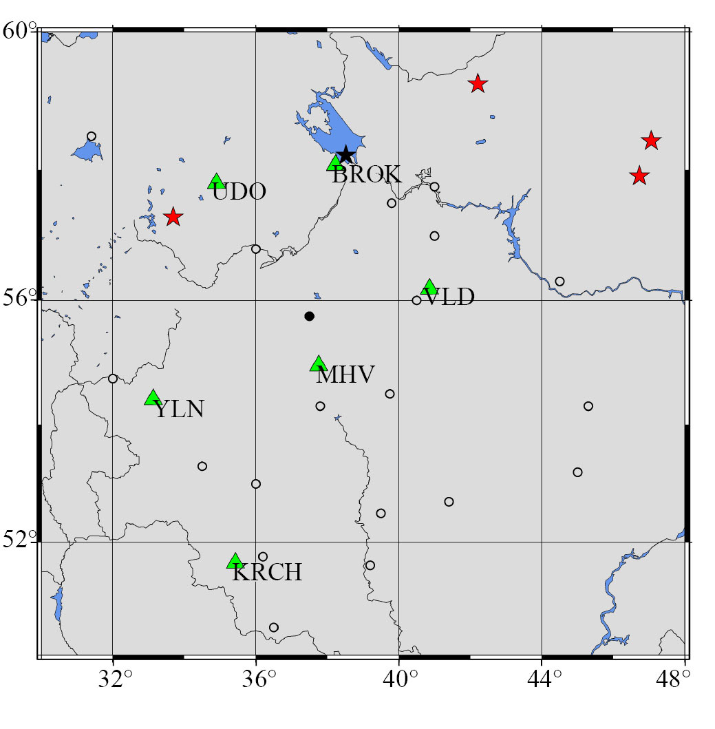Рис. 2. Карта центральной части Восточно-Европейской платформы. Зелеными треугольниками показано положение станций сейсмической сети. Эпицентр нового землетрясения отмечен черной звездой. Красными звездами отмечены эпицентры обнаруженных ранее землетрясений [6]. Кругами показаны положения областных центров России. Черным кругом показана Москва.