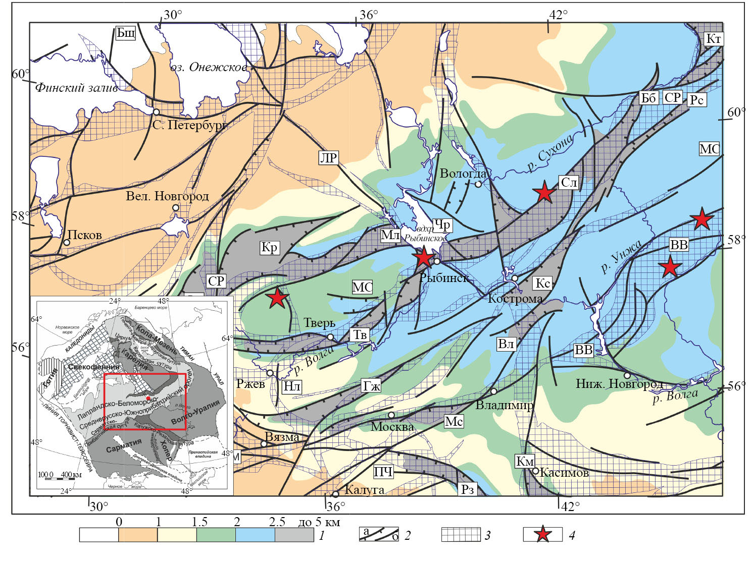 Эпицентр землетрясения в районе г. Рыбинск приурочен к Молого-Шекснинской депрессии Среднерусского пояса деформаций центральной части ВЕП (рис. 3), который прослеживается в восток-северо-восточном направлении на протяжении более 1000 км и достигает ширины 350 км [3]. В строении фундамента платформы этот пояс соответствует Лапландско-Среднерусско-Южноприбалтийскому внутриконтинентальному коллизионному орогену, на уровне кровли фундамента соответствует Среднерусской системе палеорифтовых структур рифей-ранневендского возраста – авлакогенов [11].