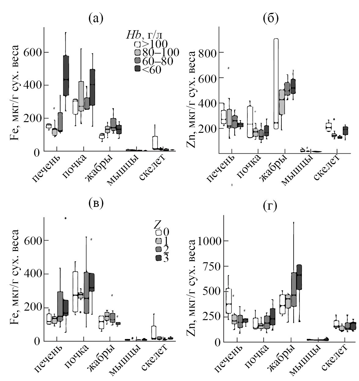 Рис. 1. Распределение железа (а) и цинка (б) в органах и тканях в зависимости от концентрации гемоглобина в крови (Hb) сигов, а также распределение железа (в) и цинка (г) в зависимости от индекса заболеваемости (Z) сигов.