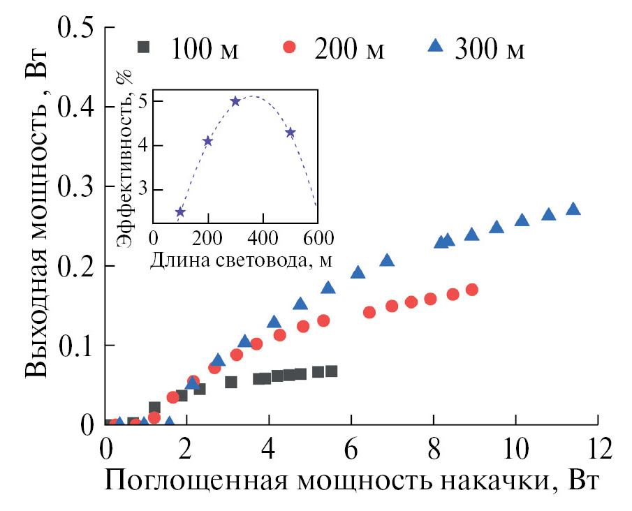 В следующих экспериментах мы использовали световод Bi-2 с измененным дизайном для повышения эффективности поглощения излучения накачки сердцевиной из оболочки за счет радиально-несимметричной формы внутренней оболочки и изменения соотношения диаметров сердцевины и оболочки. На рис. 4б показана зависимость выходной мощности лазера от поглощенной мощности накачки, а на вставке – типичный спектр лазерной генерации. Исходя из полученной зависимости и сравнительного анализа с аналогичной зависимостью для лазера на световоде Bi-1 можно сделать вывод о том, что изменение дизайна световода стало причиной повышения дифференциальной эффективности >4% и выходной мощности до 170 мВт. Заметное изменение выходной мощности также удалось достигнуть благодаря выбору оптимальной длины активного световода Bi-2. На рис. 5 показано, что с увеличением длины активного световода наблюдается заметный прирост выходной мощности >250 мВт при одинаковой вводимой мощности накачки. При достаточно длинном резонаторе (200–300 м) эффект насыщения выходной мощности становился менее заметным, но сохранялся для всех конфигураций висмутовых лазеров. В итоге максимально достигнутая эффективность висмутовых лазеров составила около 5%, а выходная мощность превысила 270 мВт при поглощенной мощности накачки 11 Вт.