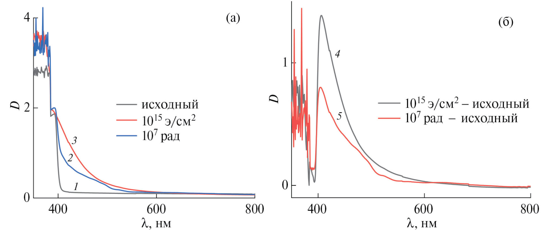 Рис. 1. Спектры поглощения исходного (1) и облученного электронами 1 ∙ 1015 cм–2 (2) и гамма-лучами дозой 107 рад (3) образцов UPS (a); разностные спектры (б) для 2 и 1 (4), 3 и 1 (5).
