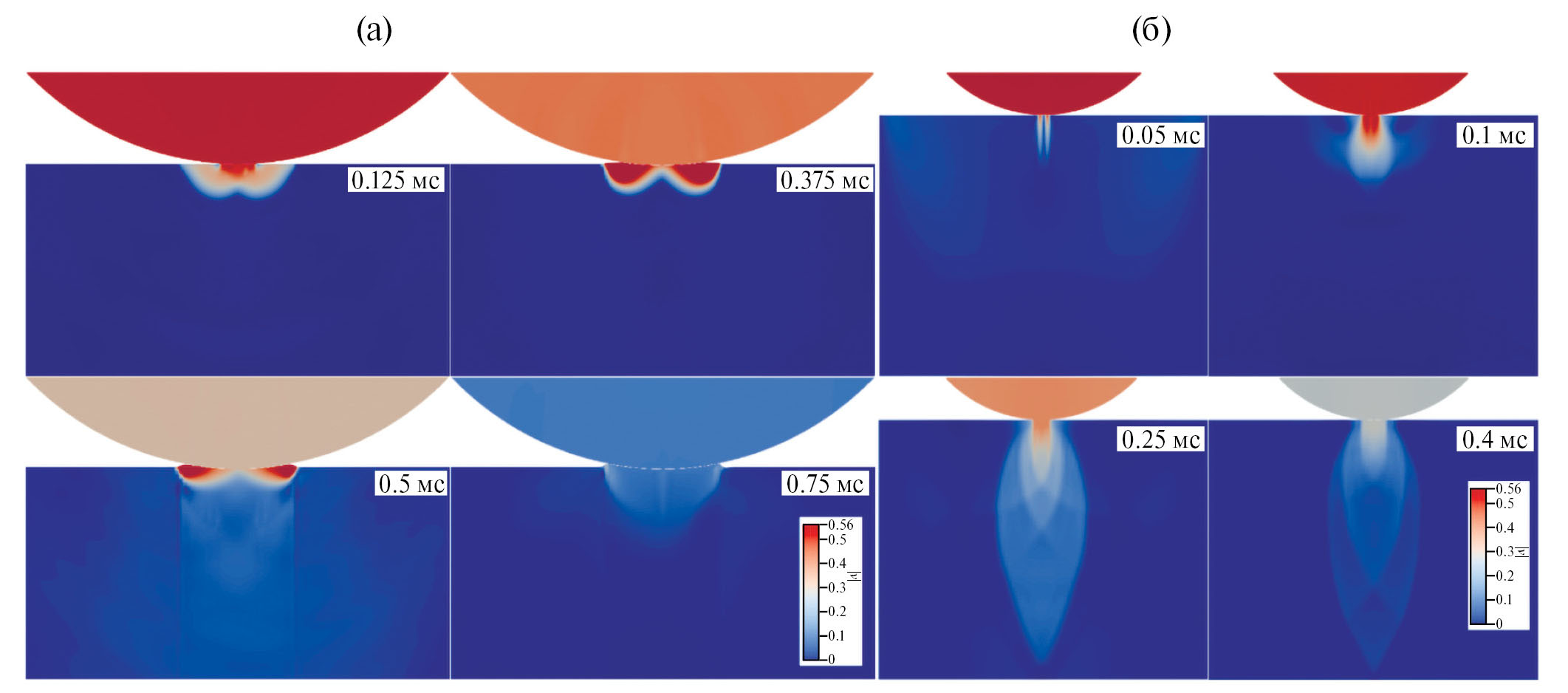 На рис. 2 представлены волновые картины в расчетах по модели упругости с упругопластическим включением (а) и модели упругопластичности с условием Мизеса–Шлейхера (б). В первом случае образуются структуры, которые, по-видимому, соответствуют образованию трещин [21] и наблюдаются в других численных экспериментах [22]. На рис. 2а также видна характерная лунка, образованная в этих структурах. Лед начинает приподниматься по краям зоны контакта с шаром в момент времени 0.375 мс после начала расчета, до тех пор, пока лунка полностью не формируется к 0.75 мс. Данные явления не наблюдаются на рис. 2б. Таким образом проявляется недостаток изображенной модели.