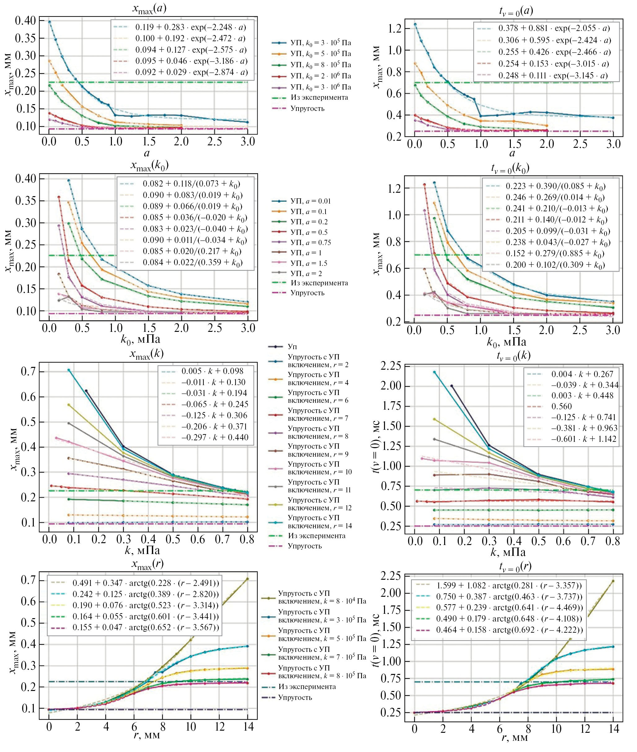 Благодаря введению зависимости предела упругости от давления открывается возможность для получения бесконечного множества параметров, позволяющих воспроизвести значения tv=0, xmax близко к экспериментальным. При этом появляется ограничение, связанное с тем, что при k0 ≥ 7.5 ∙ 105 невозможно подобрать подходящий параметр a, так как увеличение a сдвигает кривые скорости влево, дальше от нужного значения tv=0.