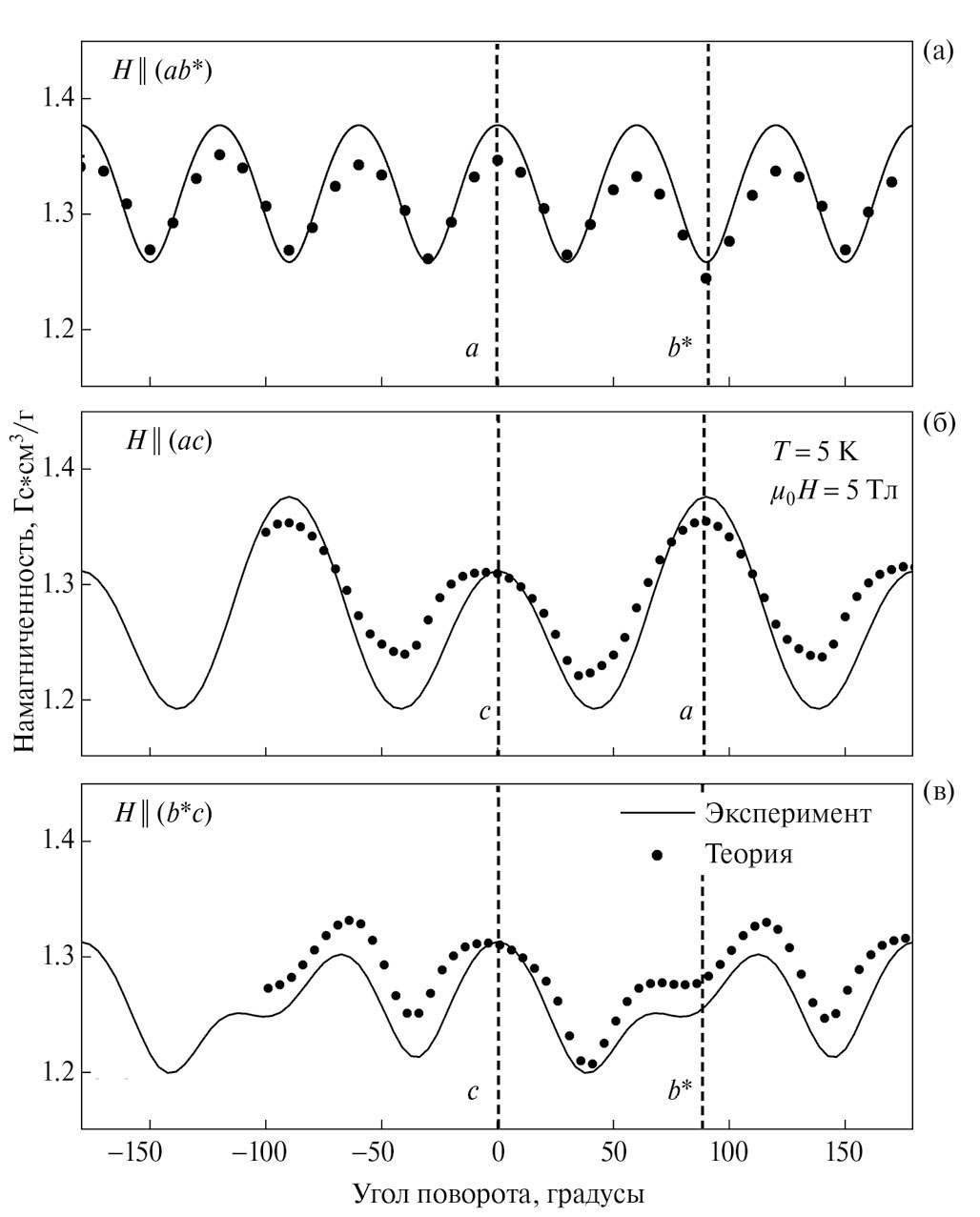 В области насыщения (при µ0H = 5 Tл и T ≲ 5 К) в ab* плоскости наблюдается 60-градусная анизотропия с максимумом вдоль оси а и минимумом вдоль оси b* (направление, ортогональное оси второго порядка а) (рис. 1a). В плоскости ас между двумя неэквивалентными по величине максимумами (при H||a и H||c) возникает асимметричный минимум (рис. 1б). Наиболее ярко особенности анизотропии намагниченности проявляются в b*c плоскости. Угловая зависимость оказалась асимметричной относительно оси с, вдоль которой наблюдается один из максимумов (рис. 1в). При вращении магнитного поля по и против часовой стрелки относительно оси с минимумы имеют разную глубину, а следующие за ними максимумы – разную величину. Ось b* расположена вблизи одного из локальных минимумов, но не совпадает с ним. При этом относительно оси b* существует асимметрия, которая, как и все вышеперечисленные особенности, возникает из-за необычной ориентации изинговских осей (рис. 2). Важно отметить, что несмотря на сложный характер анизотропии, она соответствует кристаллографической симметрии P321.
