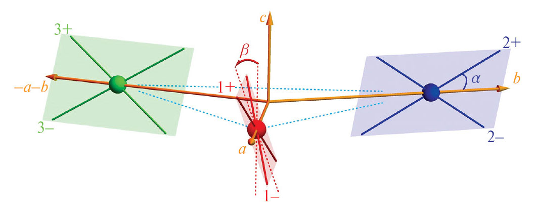 Тогда функция распределения осей в позиции 1 является инвариантной относительно преобразования симметрии С2. Позиции 2 и 3 связаны с 1 поворотом на 120° вокруг оси с, а произвольно ориентированные изинговские оси n2,3(α,β)=n1(α,β) задаются соответствующими матрицами поворота , при этом функция распределения остается неизменной. Заданные таким образом функция распределения в позиции 1 и изинговские оси в позициях 2 и 3 восстанавливают симметрию Р321, несмотря на ее локальные нарушения (рис. 2).