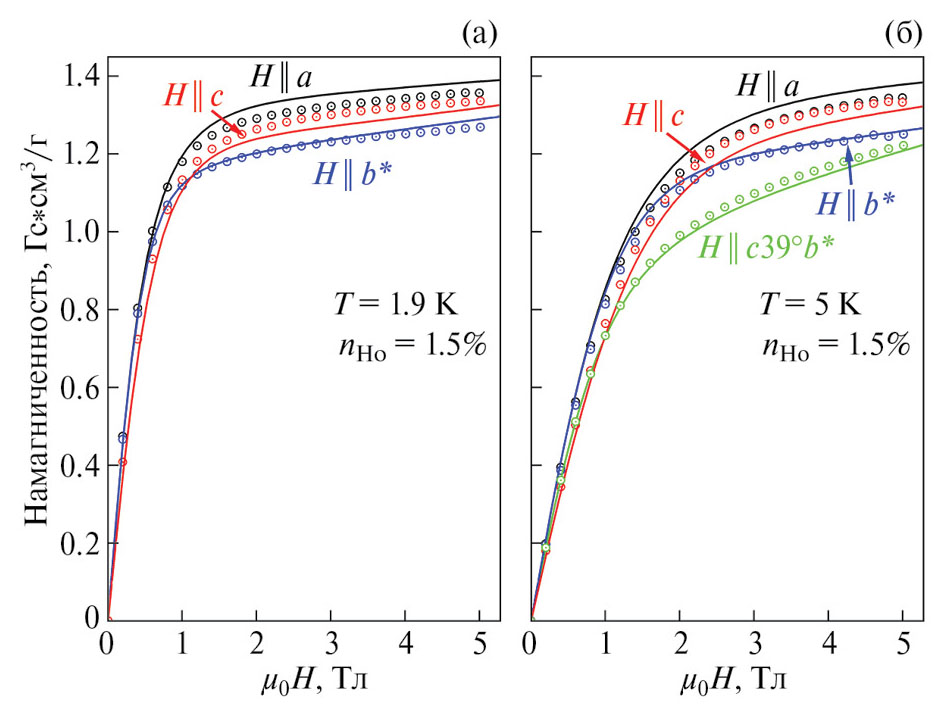 Поведение кривых намагничивания при низких температурах сильно зависит от ориентации магнитного поля. Когда поле направлено вдоль осей a, b* и с, насыщение, при низких температурах, происходит в полях ~ 1 Tл, при этом сохраняется небольшая восприимчивость (рис. 3), связанная с ван-флековским вкладом. В случае ориентации поля вдоль минимума на угловых зависимостях (рис. 3б, –H||c39ob*), насыщение намагниченности также происходит в полях ~ 1 Tл, но в области насыщения наблюдается больший угол наклона, связанный с отклонением от изинговского поведения иона Ho3+.