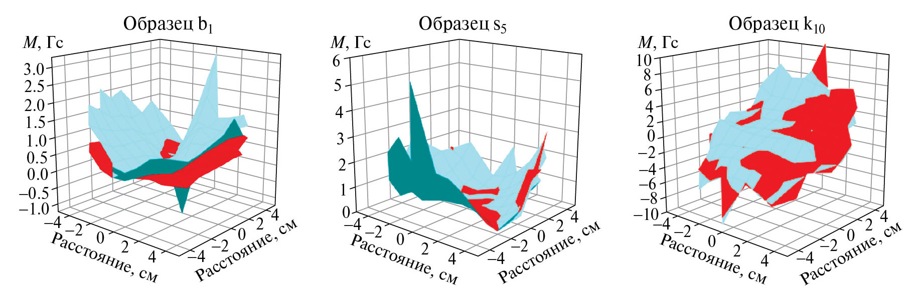 Далее проведены замеры исходных нормальных компонент остаточной намагниченности MRN образцов с двух сторон с использованием магнитометра GM2 фирмы AlphaLab Inc (точность измерения ±0.01 Гс) на прямоугольной сетке с шагом 1 см. На рис. 2 приведены изображения картины распределения MRN для одного образца из каждой рассмотренной группы.