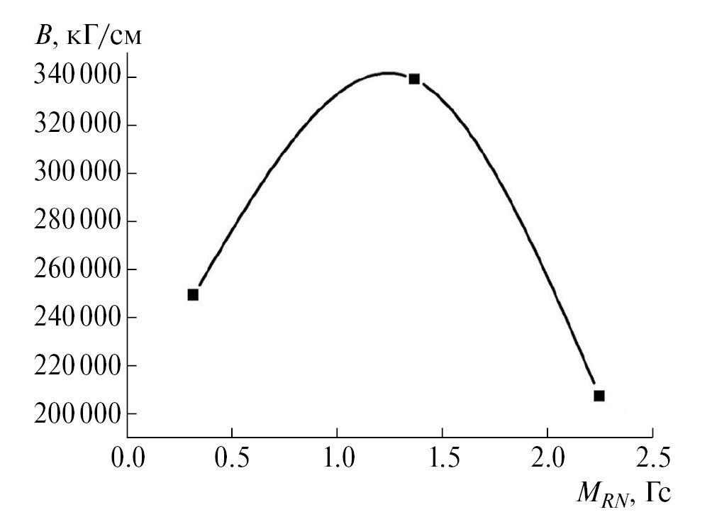 Как видно из рис. 3, жесткость образцов до определенной намагниченности, в частности до MRN = 1.37 Гс, растет, затем начинает падать. Обнаруженный эффект можно объяснить тем, что имеется критическая величина исходной остаточной намагниченности MRN, до достижения которой пассивирующий слой не разрушается, а при превышении этой величины начинается разрушение пассивирующего слоя в электрохимическом процессе коррозии.