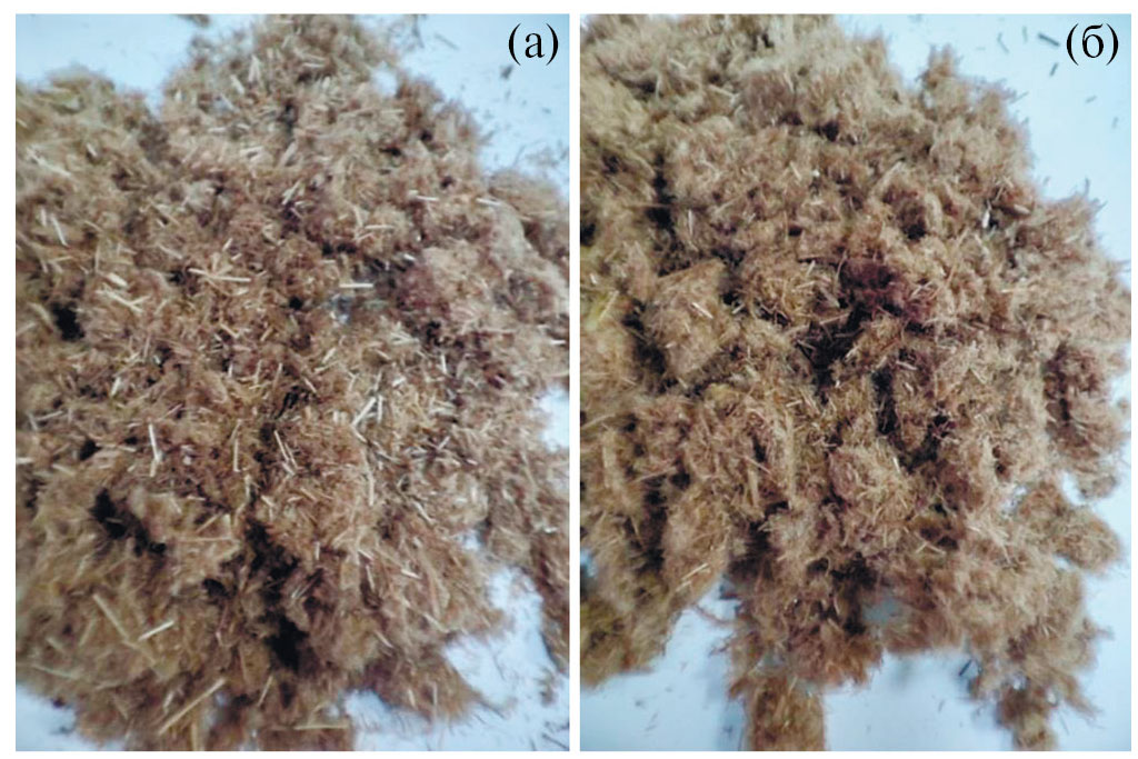 Рис. 2. Образцы соломы мискантуса после промывки и сушки: а – обработка без АГУ; б – обработка с АГУ.
