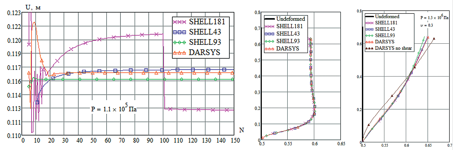 На рис. 4 приведены зависимости полного перемещения верхней точки меридиана от числа разбиений, а также деформированные конфигурации, рассчитанные в ANSYS разными конечными элементами и по формулам (12)–(16) в DARSYS при значении давления P = 1.1 ∙ 105 Па при свободном опирании и с защемленным основанием на рис. 5. Кроме того, на рис. 5 показаны деформированные конфигурации меридиана с h = 0.2 м, чтобы показать влияние учета поперечного сдвига.