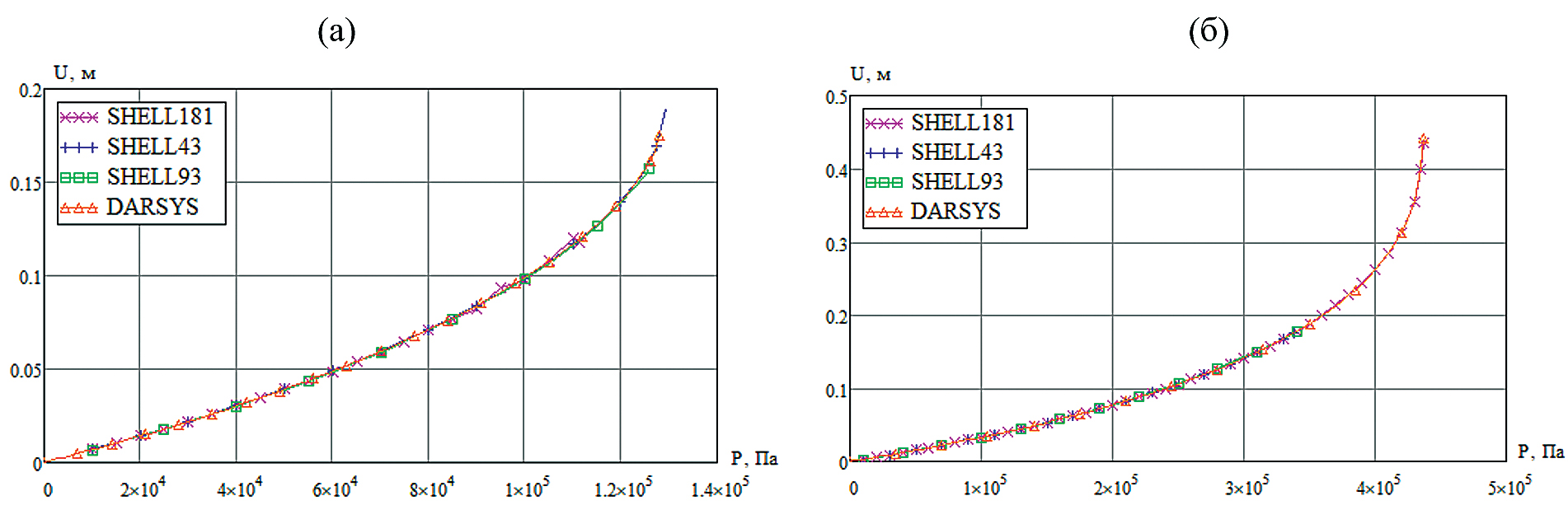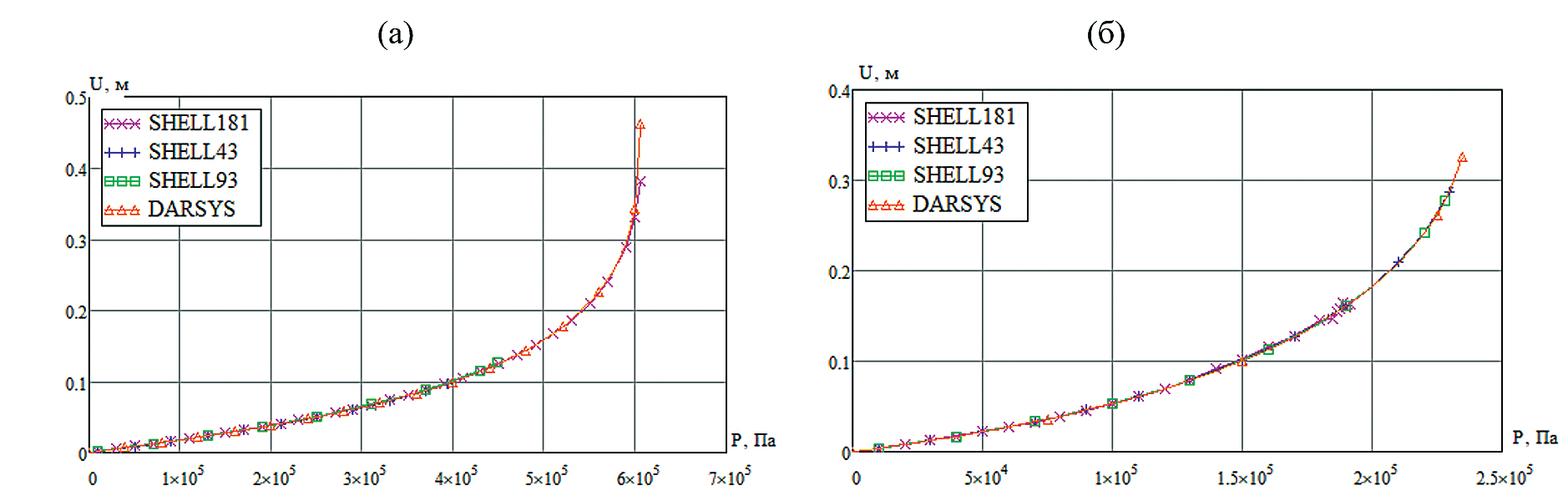На рис. 7 приведены зависимости перемещения от давления для цилиндрической (слева) и эллиптической (справа) оболочки. Нелинейность обусловлена использованием логарифмической деформации в качестве меры, а также эффектом утонения оболочки.
