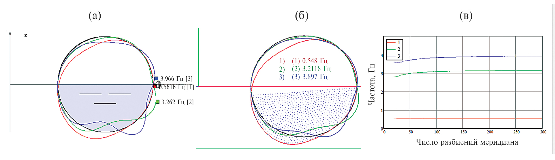 На рис. 12 приведены зависимости 3 низших частот от числа разбиений меридиана, рассчитанные в DARSYS. Из рис. 12 видно, что частоты стремятся к горизонтальным прямым с ростом числа разбиений без заметных осцилляций.