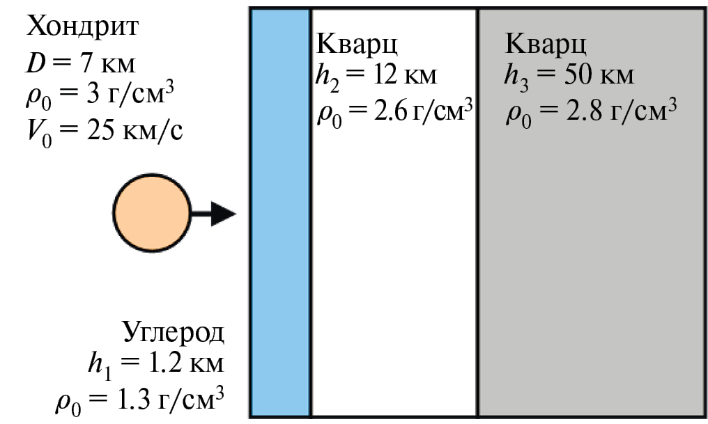 В двумерной осесимметричной постановке моделируется удар пористого хондритного микрометеорита (D = 7 км, ρ0 = 3 г/см3, V0 = 25 км/с) по поверхности Земли, представленной в виде последовательности слоев углерода и кварца. Мощность углеродосодержащего слоя в районе Попигайского кратера оценивается толщиной от 1 до 1.3 км. В расчете начальные толщины слоев составляют 1.2, 12 и 50 км, с начальными плотностями вещества ρ0 = 1.3, 2.6 и 2.8 г/см3 соответственно. На рис. 1 схематично показана постановка эксперимента.