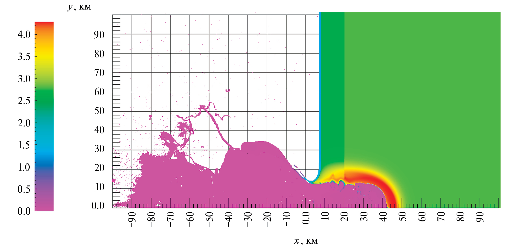 На рис. 2 представлено расчетное поле распределения плотности в материале метеорита и грунта при t = 10 с. К этому моменту фронт ударной волны уходит вглубь на глубину 50 км, контактная граница ударника углубляется до 42 км, диаметр воронки составляет 38 км. При этом максимальное давление во фронте волны спадает до 0.9 ГПа.