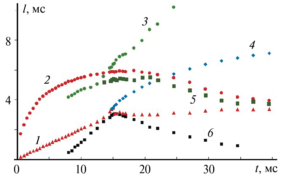 Растущая каверна появляется в поле зрения с запаздыванием ∆t = 6.86 мс. Глубина каверны вначале линейно увеличивается со временем hca(t) = 0.36t мм на интервале 8 < t < 15.5 мс, достигает максимума при t = 16 мс, а далее монотонно убывает hca(t) = 30/t мм на интервале 17 < t < 40 мс (кривая 6, рис. 4). Каверну окружает область депрессии (отмечена на рис. 1, t = 14 мс), диаметр которой также растет пропорционально времени dd(t) = 0.43t мм при 8 < t < 16 мс. Диаметр каверны dca(t) =0.7 + 100 / t мм, появляющейся в поле зрения, несколько меньше ширины интрузии. Со временем размеры объединенных компонентов начинают сближаться.