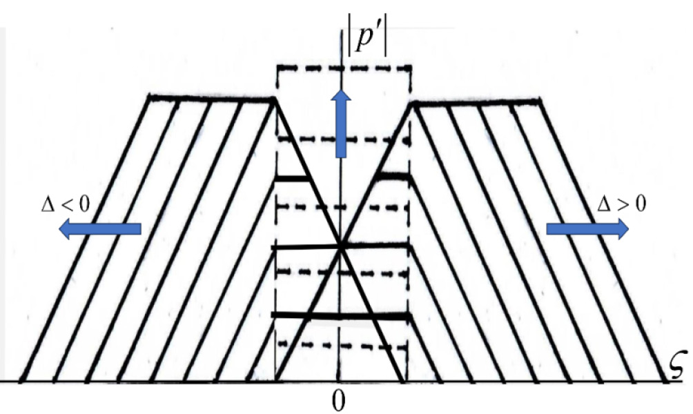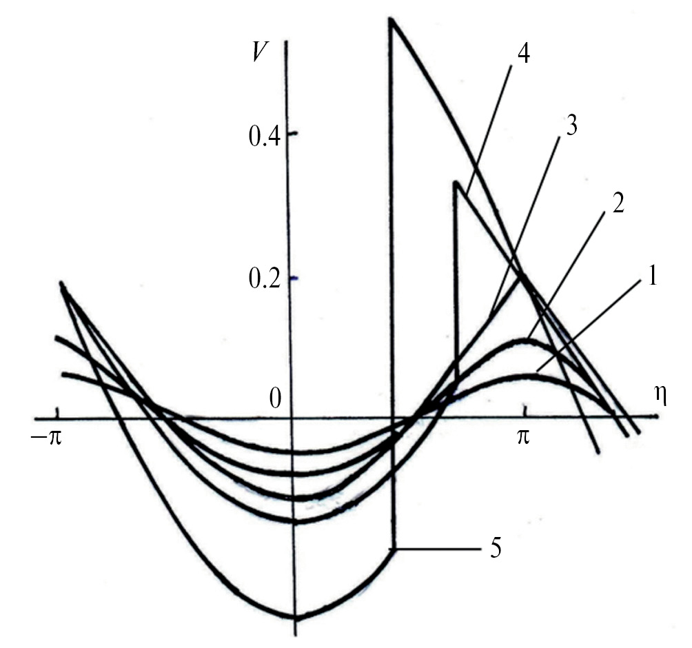 Здесь – параметр. Аргумент функции определен в области . Из (27) следует, что соответствующая область изменения расстройки дается неравенствами . При происходит бифуркация и стационарная волна становится разрывной. Скачок появляется в каждом периоде профиля, связывая две ветви решения (26). Для разрывной волны