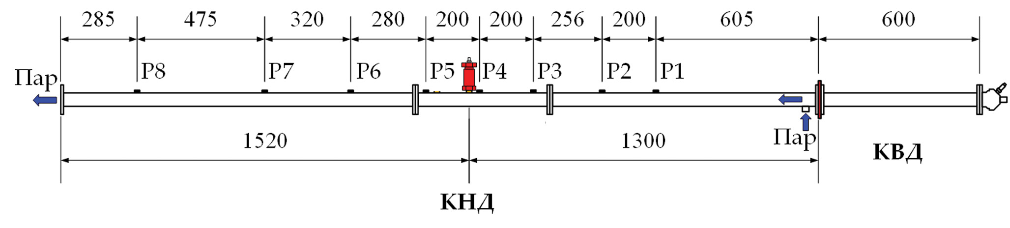 Основной элемент экспериментальной установки – обогреваемая (термостатированная) ударная труба (рис. 1) с камерой низкого (атмосферного) давления (КНД) длиной 2.82 м и камерой высокого давления (КВД) длиной 0.6 м, разделенными медной мембраной. Левый конец КНД (см. рис. 1) сообщается с атмосферой, а КВД заполняется метанокислородной взрывчатой смесью при начальном давлении от 0.2 до 0.6 МПа. Через КНД непрерывно прокачивается перегретый водяной пар с температурой от 140 до 180 °С. Чтобы предотвратить конденсацию водяного пара, температура стенок КНД поддерживается на уровне 115–125 °С.