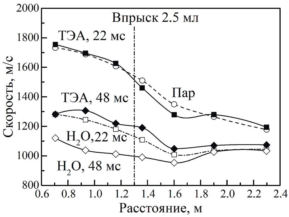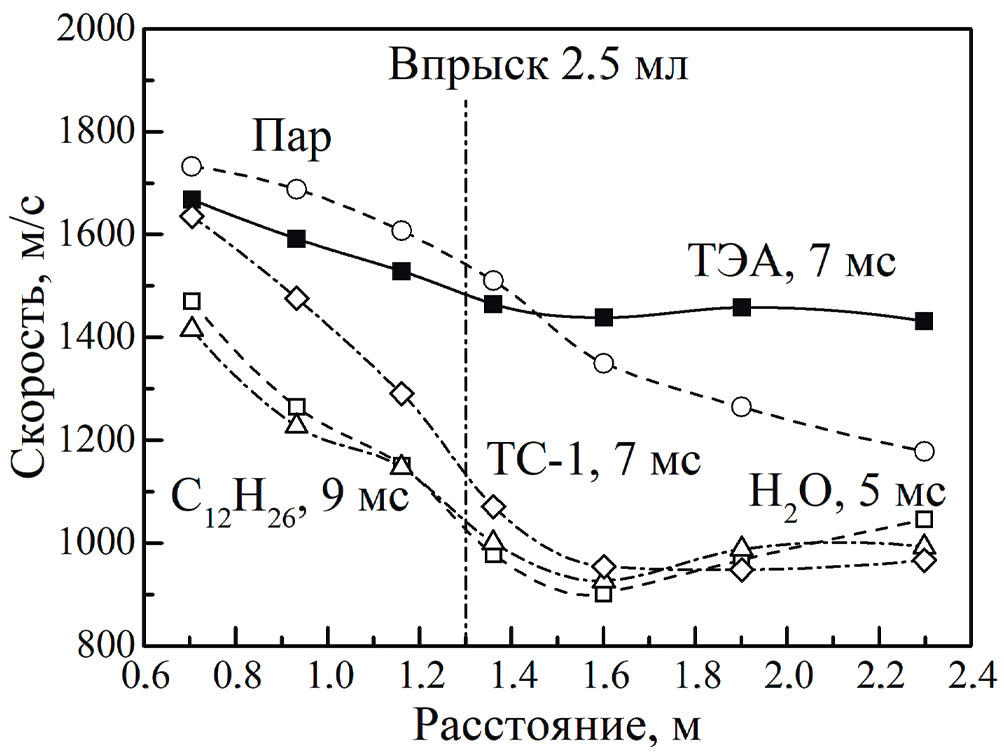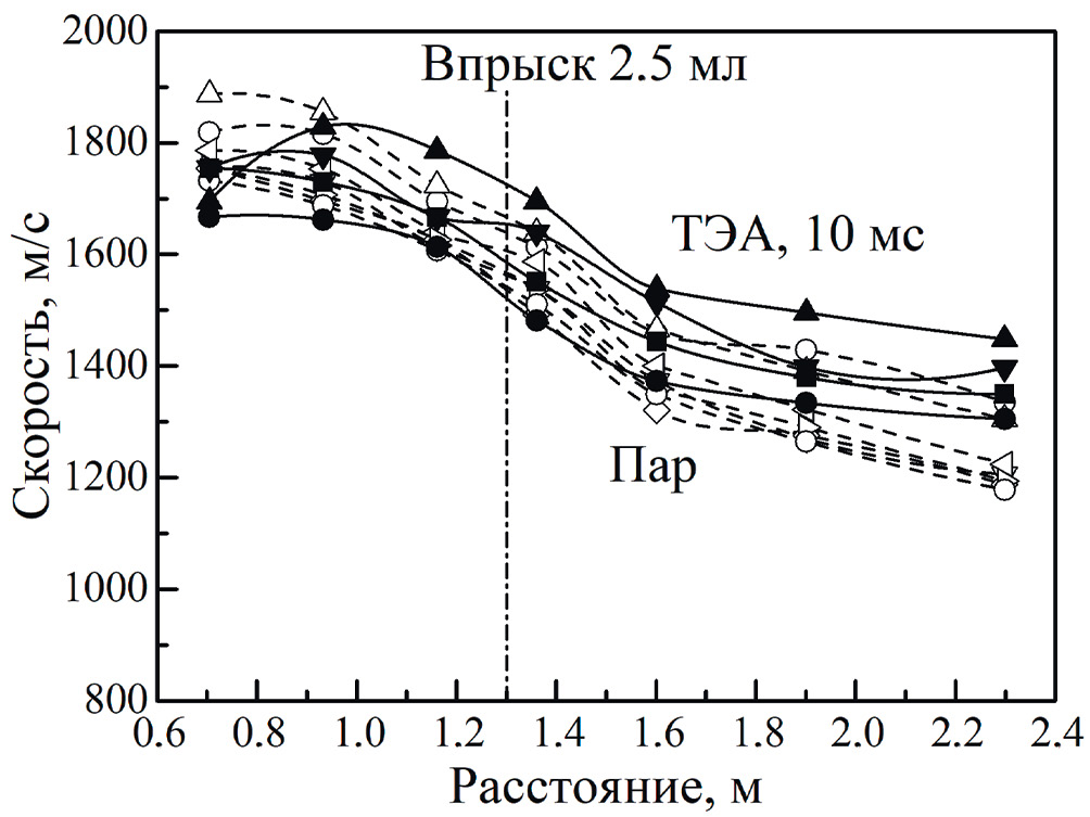 При впрыске ТЭА (кривая “ТЭА, 7 мс”) ударная волна на участке КНД до распылителя несколько ослабляется, а затем распространяется по трубе с приблизительно постоянной скоростью 1500 м/с, которая на 500–600 м/с выше, чем при впрыске других жидкостей. Такое поведение кривой для ТЭА однозначно свидетельствует о вкладе энерговыделения в реакции между ТЭА и ударно-сжатым перегретым водяным паром.