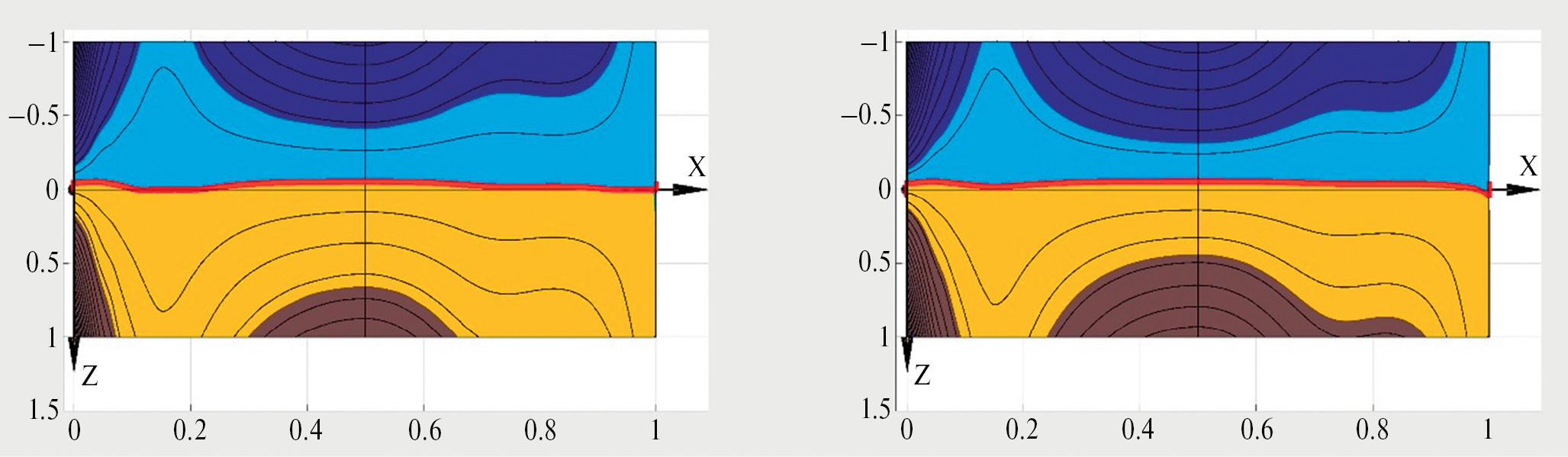 Для визуализации представлены 4 цвета интенсивности деформации ei, указывающие на величину деформации, превышающую или не превышающую предел деформации. Коричневый цвет обозначает превышение предела прочности при растяжении, оранжевый – интенсивность деформации ниже предела прочности. Для синего и голубого цветов обозначения аналогичны, но только для сжатия. Красная линия обозначает нейтральную поверхность пластинки.
