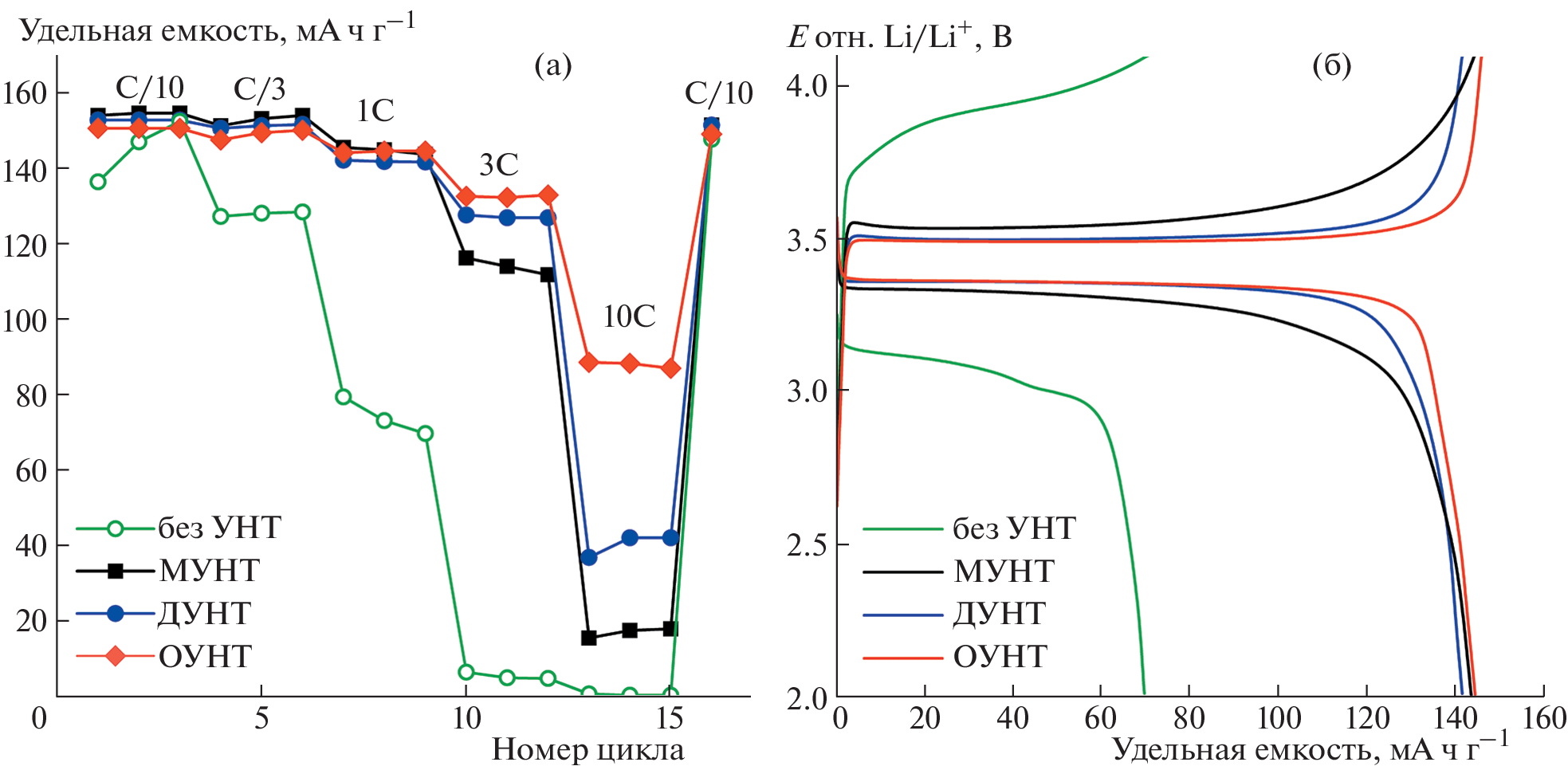 В работе проведено сравнительное исследование характеристик положительных электродов на основе феррофосфата лития, содержащих добавки различных типов коммерчески доступных углеродных нанотрубок – одностенных (ОУНТ), двустенных (ДУНТ) и многостенных (МУНТ). Электрохимические характеристики катодных материалов были исследованы с помощью спектроскопии электрохимического импеданса и гальваностатического заряда/разряда. Оценена циклическая устойчивость при различных плотностях тока. Наилучшими электрохимическими характеристиками обладают катодные материалы с ОУНТ (преимущество перед ДУНТ при высоких скоростях разряда от 10С) и ДУНТ (преимущество перед ОУНТ при длительном циклировании) в составе. При длительном циклировании при плотности тока 1С наибольшую потерю емкости демонстрирует электрод на основе МУНТ. При этом электроды с ОУНТ и ДУНТ демонстрируют удовлетворительное сохранение емкости после 50 циклов заряда/разряда: свыше 94 и свыше 98% соответственно.