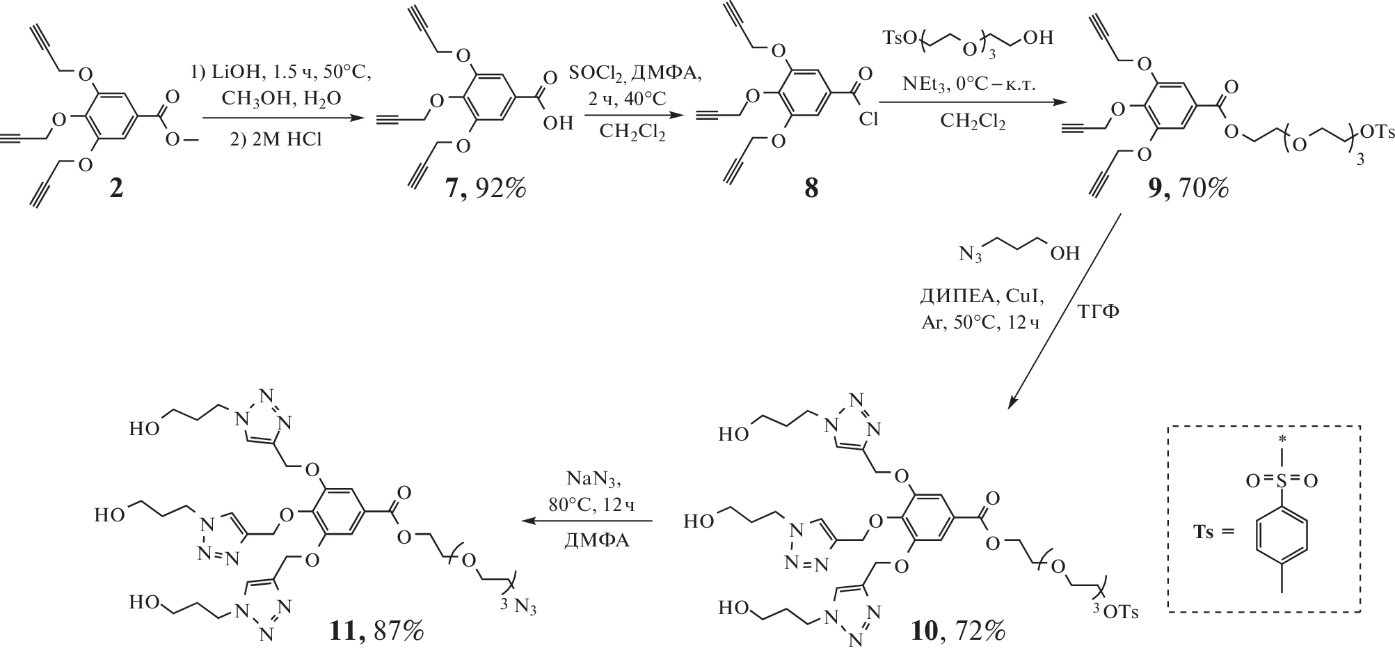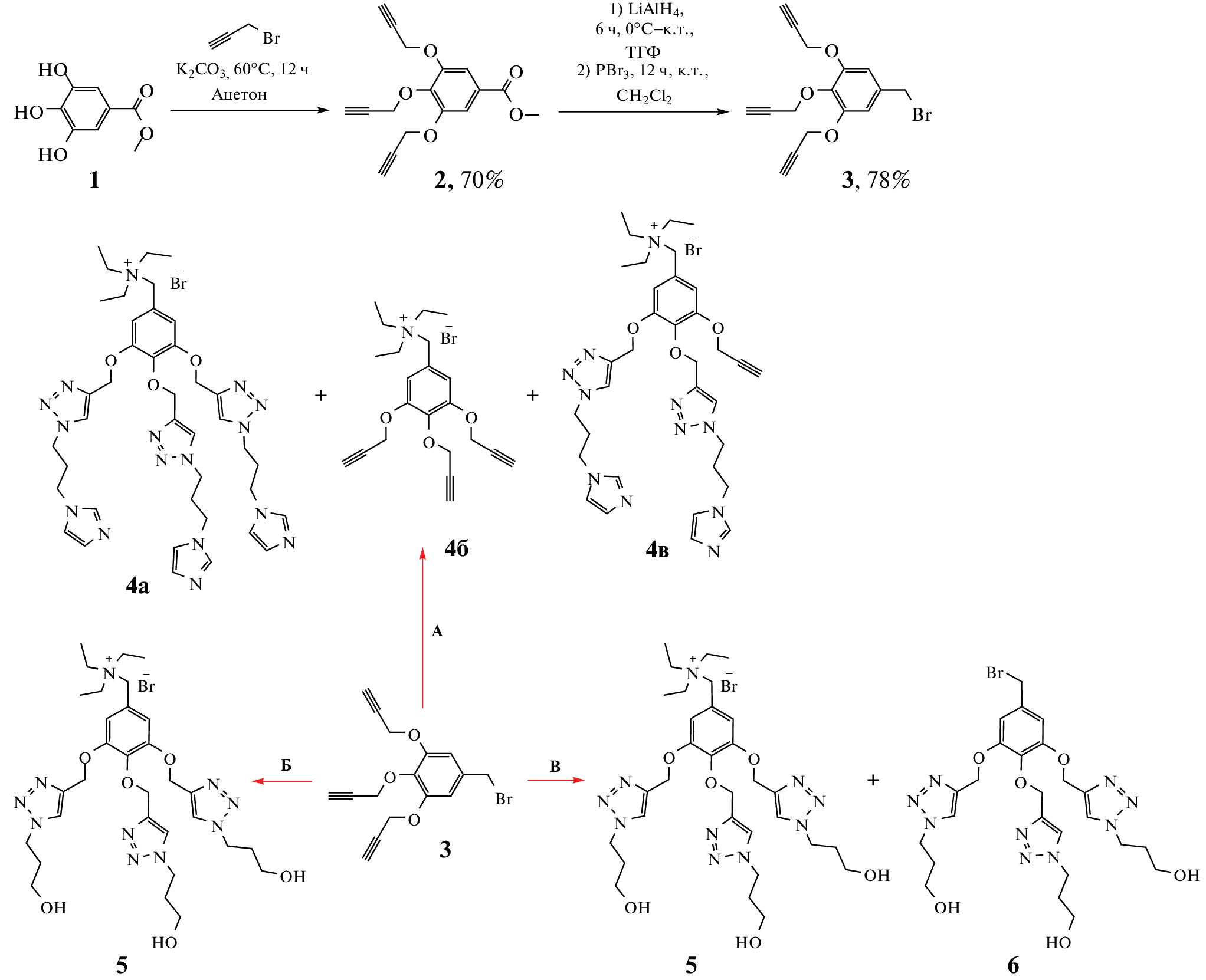 By stepwise modification of gallic acid using an azide-alkyne cycloaddition reaction, a first-generation triazole-containing dendron with hydroxypropyltriazole groups and a tetraethylene glycol linker was obtained for the first time. The structure of all intermediate compounds has been proven by modern physical methods. It has been established that the use of bromomethylene derivatives of gallic acid in the synthesis of triazole-containing dendrons results in the formation of by-products of alkylation of the bases used in the reaction (triethylamine and diisopropylethylamine) due to the high mobility of the bromine atom in the benzyl position.