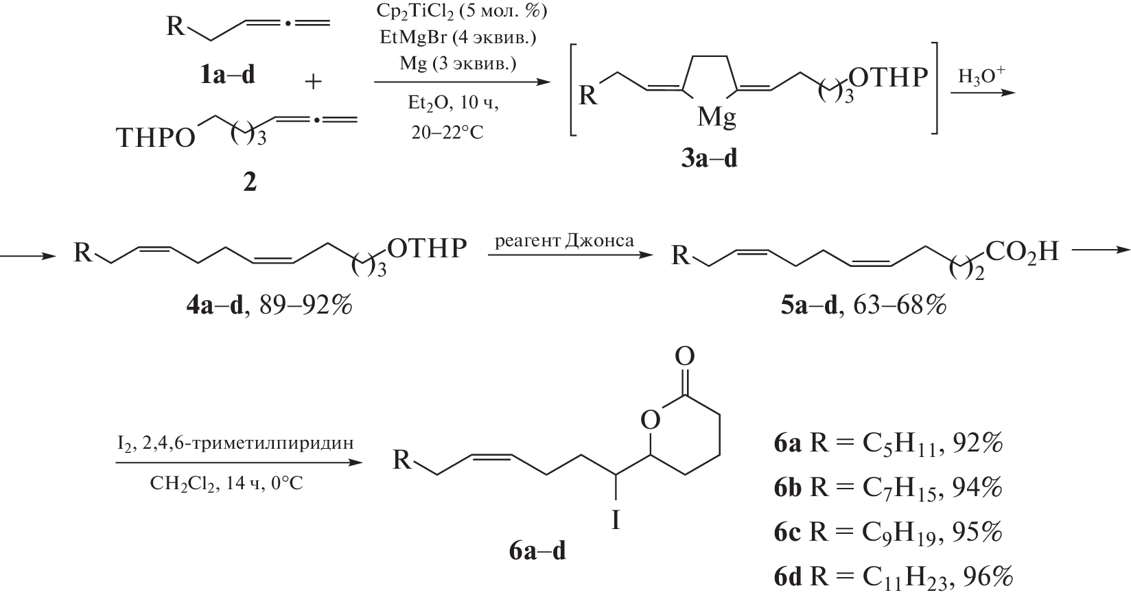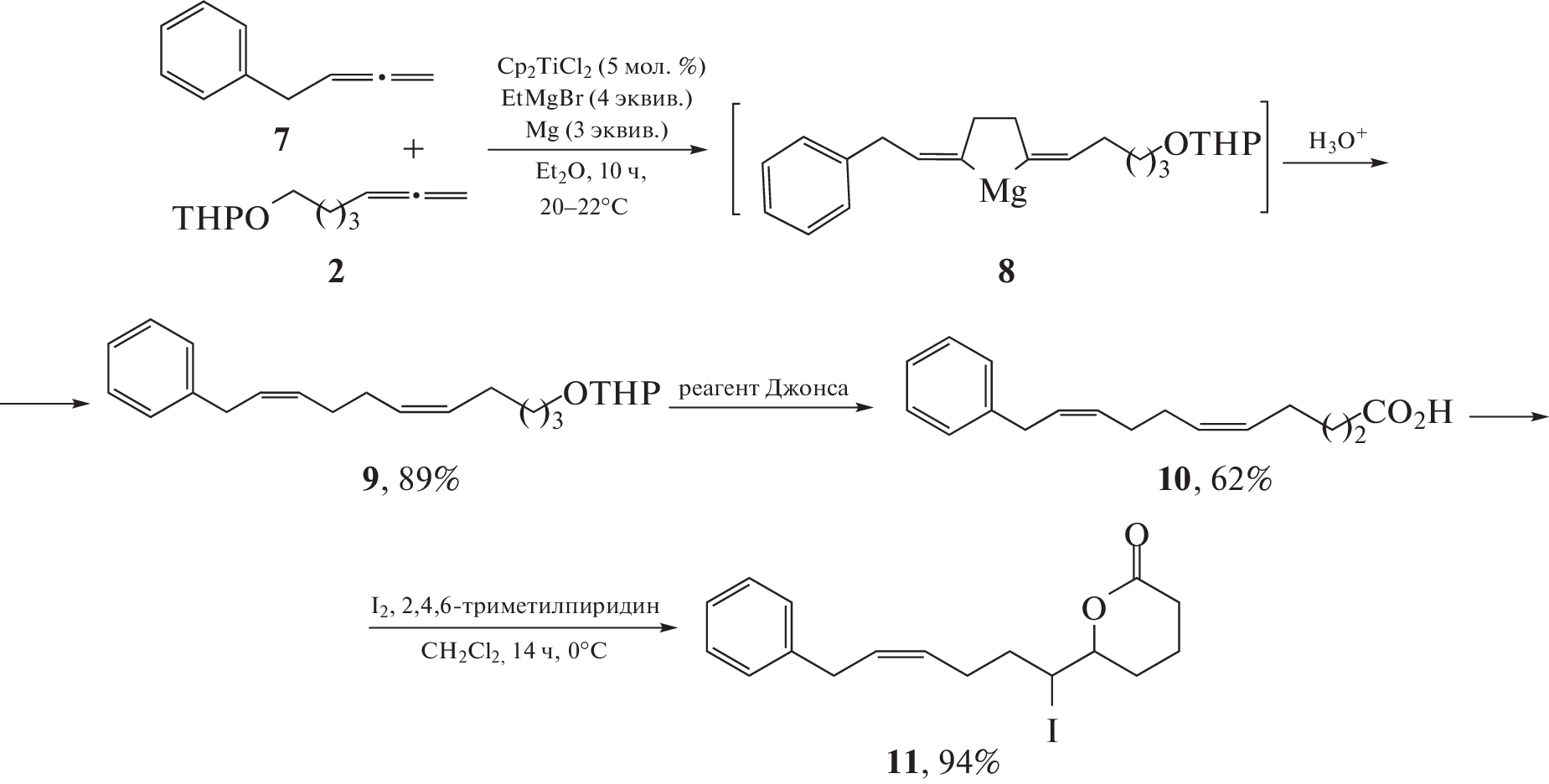Синтезирован ранее неописанный фенил-замещенный йод-δ-лактон 11-фенилундека-5Z,9Z-диеновой кислоты с применением на ключевой стадии реакции Ti-катализируемого межмолекулярного кросс-цикломагнирования ароматического 1,2-диена с О-содержащим алленом с выходом 94%. Изучена цитотоксическая активность in vitro полученных алкил- и фенил-замещенных йод-δ-лактонов 5Z,9Z-диеновой кислот по отношению к клеточным линиям Jurkat, K562, U937, HL60, HEK293, а также исследовано влияние на клеточный цикл и способность индуцировать апоптоз с помощью проточной цитофлуориметрии.