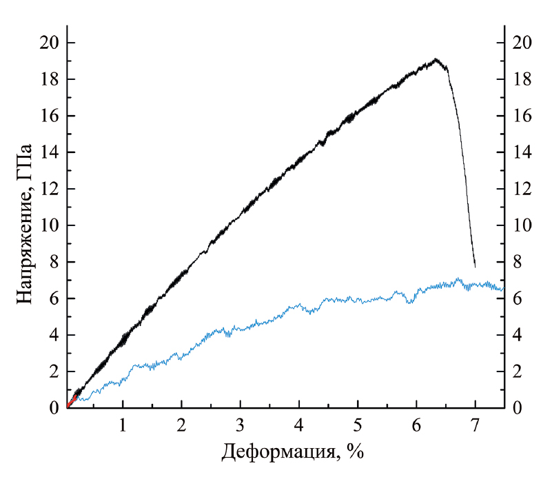 Было проведено сравнительное МД-моделирование одноосного растяжения в направлении <100> бездефектного бесконечного и поликристаллического высокоэнтропийного карбида (Ti0.2Zr0.2Hf0.2Nb0.2Ta0.2)C (рис. 4).