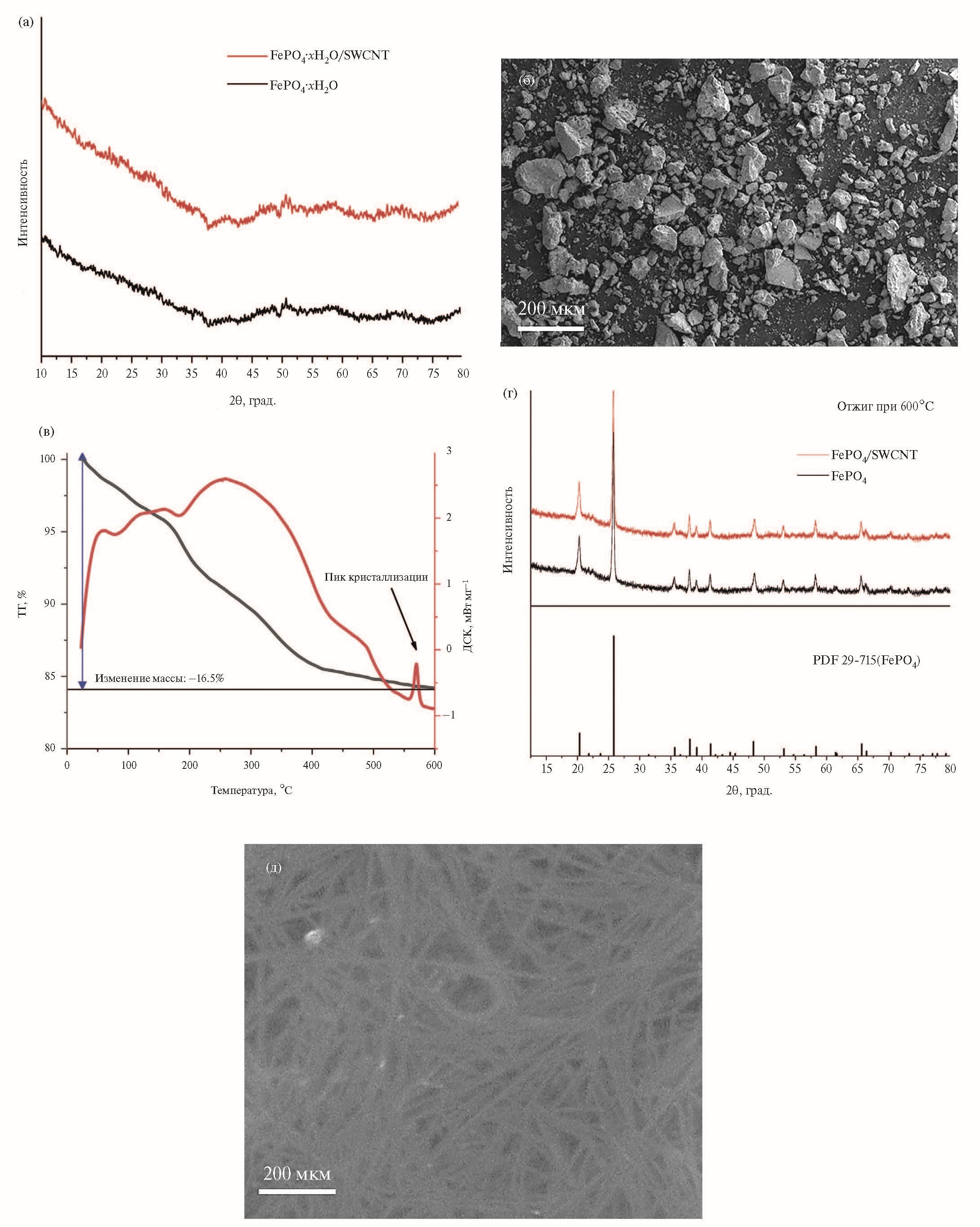 Осажденный фосфат железа представляет собой гидратированный аморфный мелкодисперсный порошок светло-желтого цвета. При осаждении в присутствии SWCNT структура остается аморфной (рис. 2а, красная кривая). При этом на рентгенограмме отсутствуют рефлексы, характерные для SWCNT [47], что связано с низкой массовой концентрацией SWCNT (0.025 мас. %) в осажденном фосфате железа.