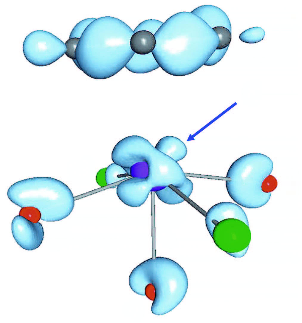 Характер взаимодействия Lu∙∙∙C в сечениях ДЭП проиллюстрировать достаточно сложно, поэтому мы рассчитали трехмерное распределение деформационной электронной плотности в области координационного узла (C⁵)Lu(Cl)²(O)³в комплексе 1 (рис. 3).