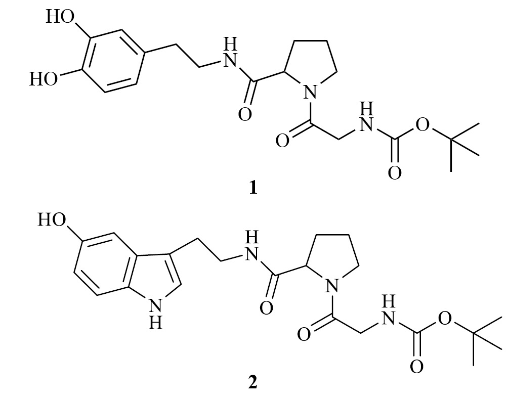 Рис. 2. Структуры Boc-Gly-Pro-DOPA (1), Boc-Gly-Pro-5-НТ (2).
