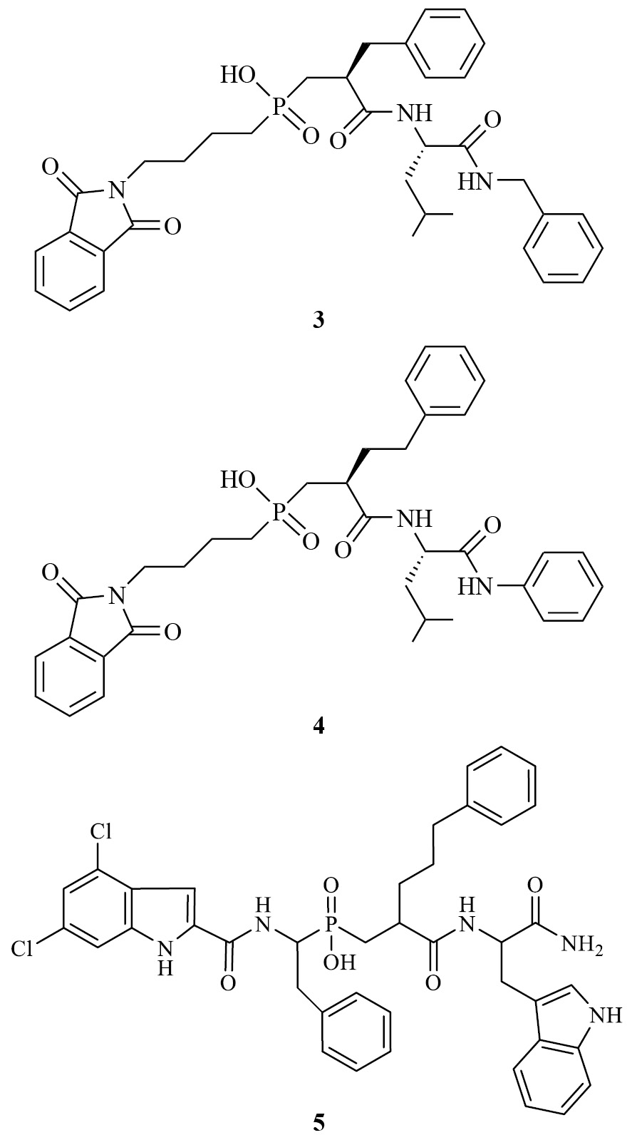 Фосфинатные пептиды являются мощными ингибиторами бактериальных коллагеназ [30]. Также оказалось, что фосфинатные псевдопептиды (соединения 3–5) ведут себя как сильнодействующие ингибиторы матричных металлопротеиназ (ММР) (рис. 3).