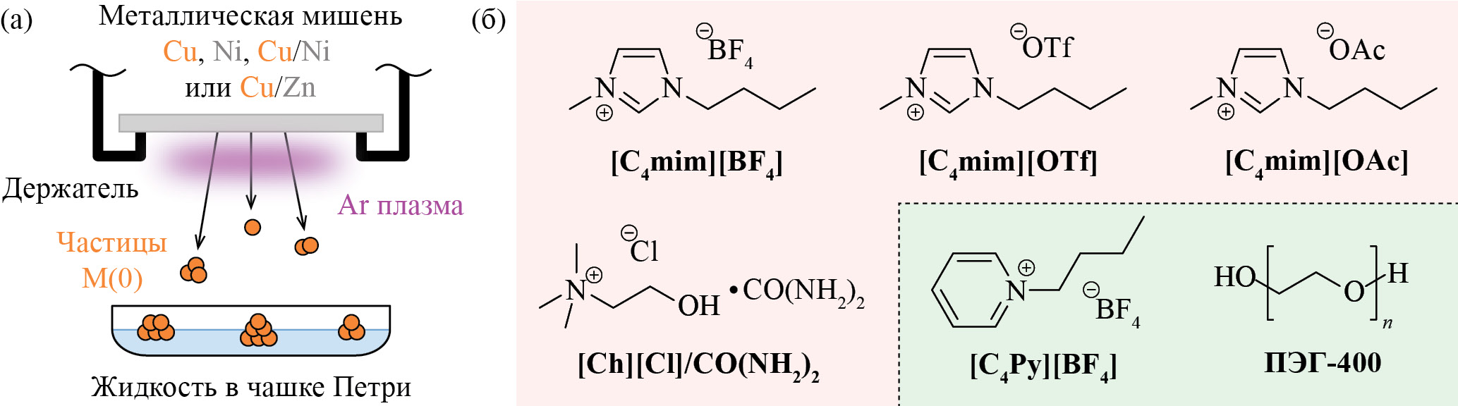 В серии проведенных экспериментов частицы меди, используемой в качестве модельного металла, распыляли на поверхность различных жидкостей под действием аргоновой плазмы в атмосфере разреженного аргона при комнатной температуре (рис. 1а), данная техника использовалась и в дальнейшем при приготовлении частиц никеля и сплавов на основе меди. Одним из важнейших типов растворителей, использованных в работе, были ионные жидкости. Эти органические соли являются устойчивыми даже в условиях высокого вакуума и, кроме того, зарекомендовали себя в качестве удобной среды для проведения различных каталитических превращений. Существенным недостатком ионных жидкостей является их высокая гигроскопичность и склонность к распаду благодаря наличию подвижного атома водорода в гетероцикле. В работе были использованы три имидазолиевые ионные жидкости общей формулы [C4mim][A] с различными анионами ([A] = [BF4], [OTf], [OAc]), а также пиридиниевая ионная жидкость [C4Py][BF4], характеризующаяся большей устойчивостью к разложению с элиминированием атома водорода, находящегося во втором положении пиридинового кольца, по сравнению с имидазолиевыми аналогами. В качестве альтернативы ионным жидкостям были рассмотрены глубокие эвтектические растворители на примере смеси хлорида холина и мочевины. Высококипящие низкомолекулярные растворители, такие как диметилформамид и диметилсульфоксид, оказались непригодными к применению в условиях вакуума камеры магнетронного распыления, поскольку наличие даже минимальных испарений вызывало неконтролируемую ионизацию всего объема камеры. Высокомолекулярные же растворители, такие как полиэтиленгликоль ПЭГ-400, были успешно использованы в эксперименте (рис. 1б). Визуальный анализ результатов напыления частиц меди во все рассмотренные среды показал, что задействованные в работе имидазолиевые ионные жидкости, а также эвтектика на основе хлорида холина и мочевины активно реагируют с металлической медью с образованием прозрачных растворов зеленого цвета, содержащих ионы Cu2+, что может быть объяснено высокой кислотностью этих жидкостей, обусловленной описанными выше причинами. В полном соответствии с данным предположением пиридиниевая ионная жидкость, обладающая меньшей склонностью к разрыву связи C(2)–H, оказалась более инертной по отношению к напыляемым частицам. Отличные результаты продемонстрировал и полиэтиленгликоль ПЭГ-400, несмотря на свою гигроскопичность. Металлическая фаза, напыленная в данную среду, также оказалась устойчива в условиях проведения эксперимента (рис. 1б). На основании полученных данных можно заключить, что примеси воды и кислорода, характерные как для ионных жидкостей, так и для ПЭГ-400, являются не столь критичными и могут быть удалены при предварительном вакуумировании. Наличие же примесей кислотного характера, а именно кислот HA, в ионных жидкостях типа [C4mim][A], является более существенным фактором, влияющим на устойчивость металлических частиц.