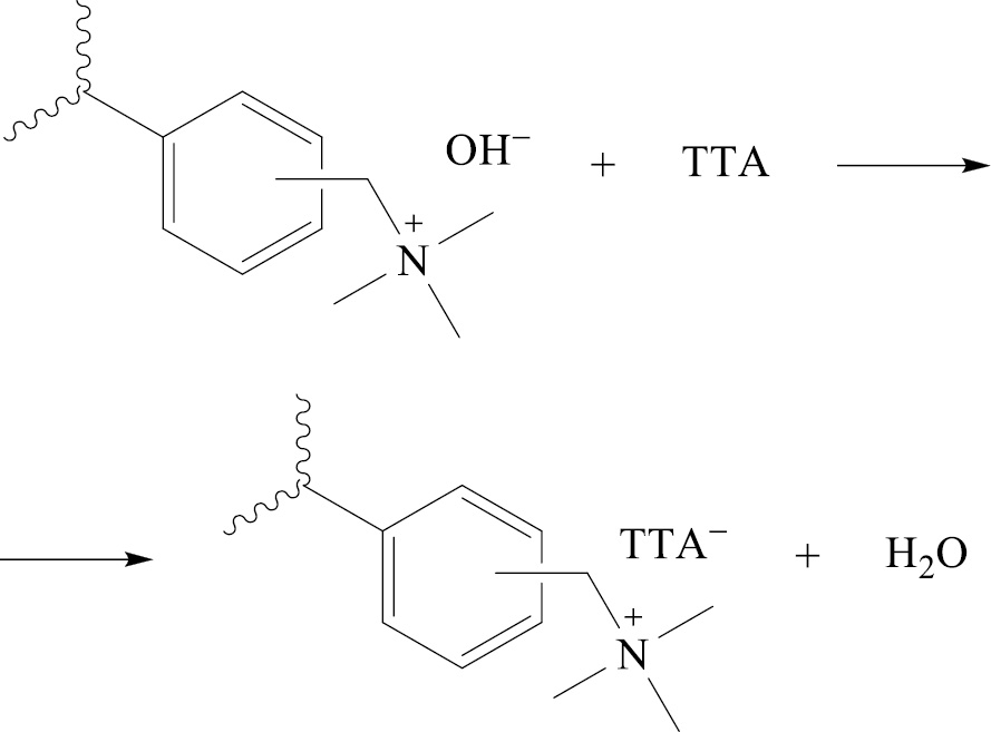 Опыты проводили с разбавленными золями НИА: во всех опытах концентрация ТТА многократно превышала концентрацию НИА (функциональных групп НИА). В этих условиях гидроксидная форма НИА переходит в теноилтрифторацетонатную (схема 1): этот процесс можно рассматривать как ионный обмен или как нейтрализацию слабой кислоты в фазе ионита.