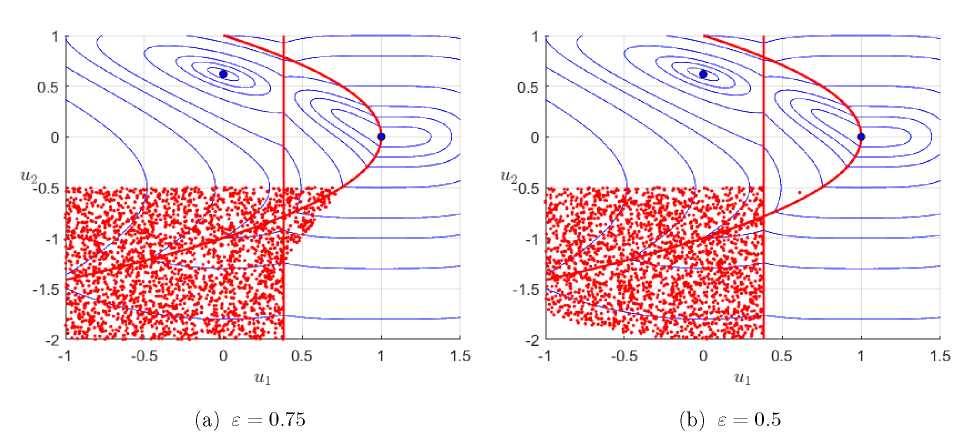 На рис. 2–4 синими точками показаны два решения и данной задачи, а синие линии являются линиями уровня функции Красные линии соответствуют границам между областями активности разных гладких кусочных отображений, и, в частности, состоят из точек в которых содержит более одного индекса.