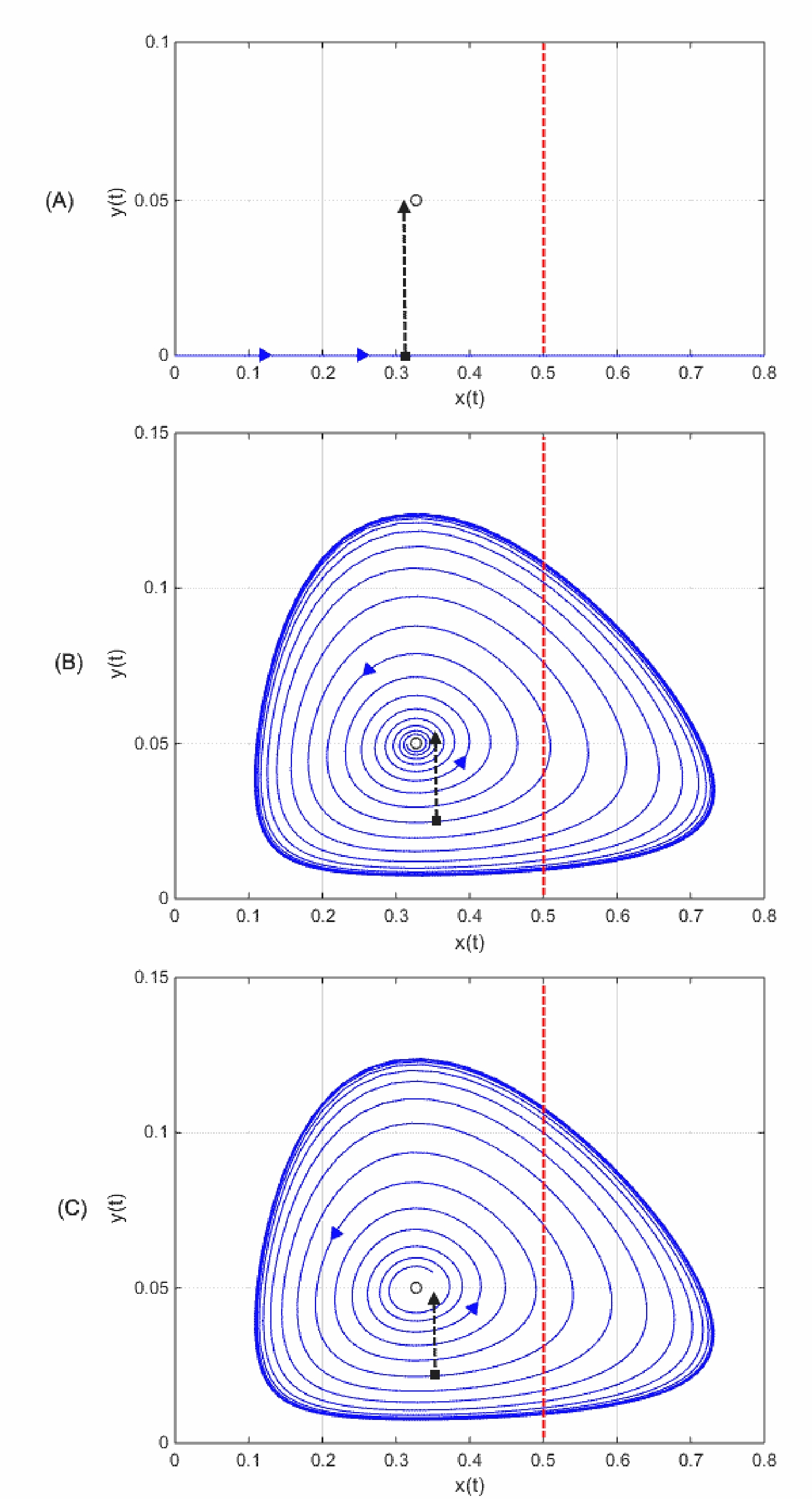 Рис. 2. Шаги построения допустимого управления в рамках системы (2.2). Синие стрелки показывают направление движения по кривым фазового состояния. Черной окружностью изображено положение равновесия E системы (1.1), красной пунктирной линией изображено пороговое значение поражения агрокультуры, черные пунктирные векторы отображают импульсные воздействия на экосистему теплицы. Рисунки (A), (B) и (C) отвечают первому, второму и третьему импульсному воздействию, соответственно