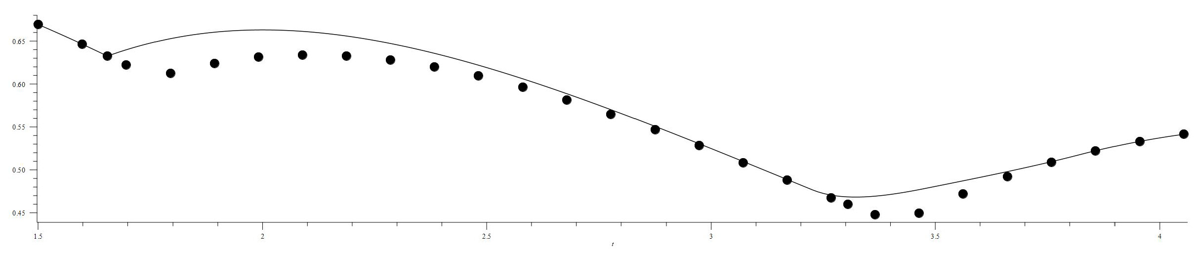 Для случая точной оценки коэффициентов не найдено. Если взять разбиение по t — 0.01, а по — 0.033, то мы получим очень хорошее приближение к кривой В этом разбиении по t — 685 точек, по — 32 точки, а по —1985 точек.