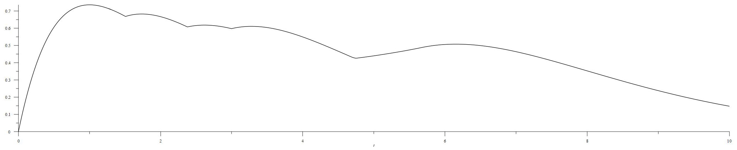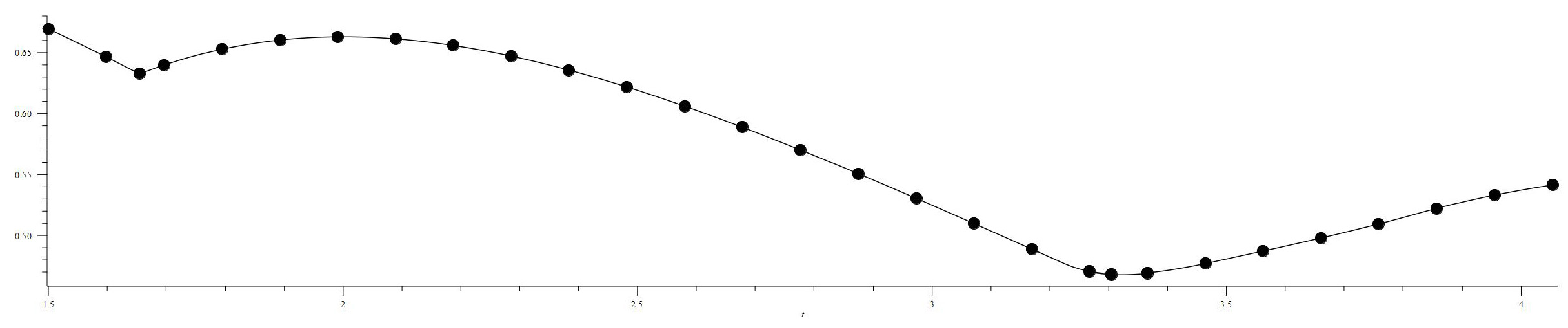 Возьмем теперь сеть, полученную достаточно грубым разбиением по t — 0.1, а по z — 0.2. В этом разбиении по t — 75 точек, по — 6 точек, а по — 61 точка. Выполним локальный поиск в каждой точке получившейся сети. Все узловые точки полученной таким образом ломаной линии лежат на кривой, изображенной на рисунке 10. Следовательно, при каждом t в этой сети была найдена точка, лежащая в области притяжения точки глобального максимума целевой функции.