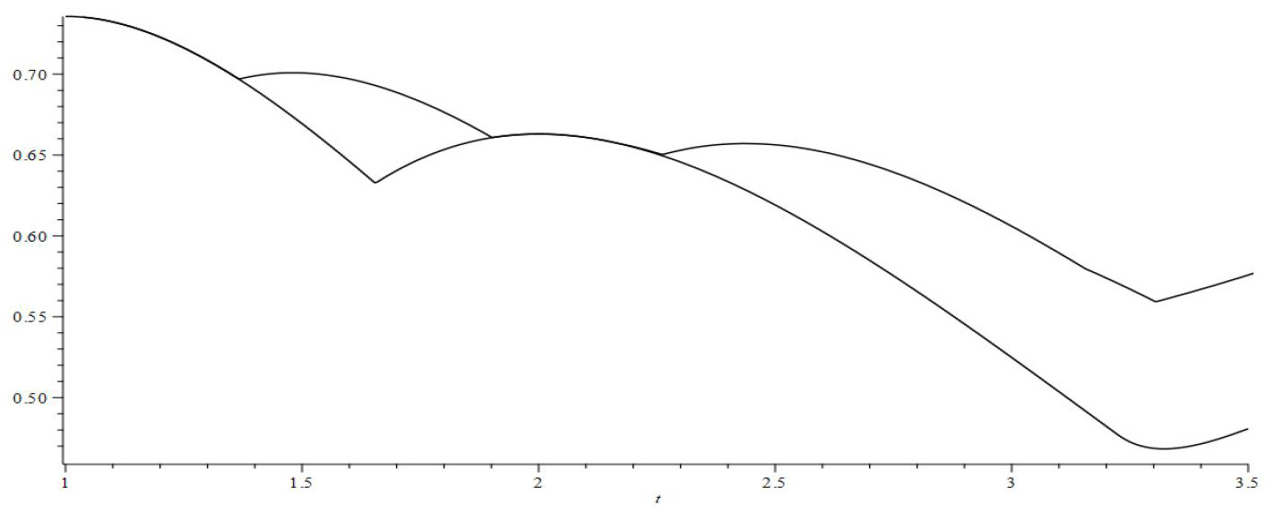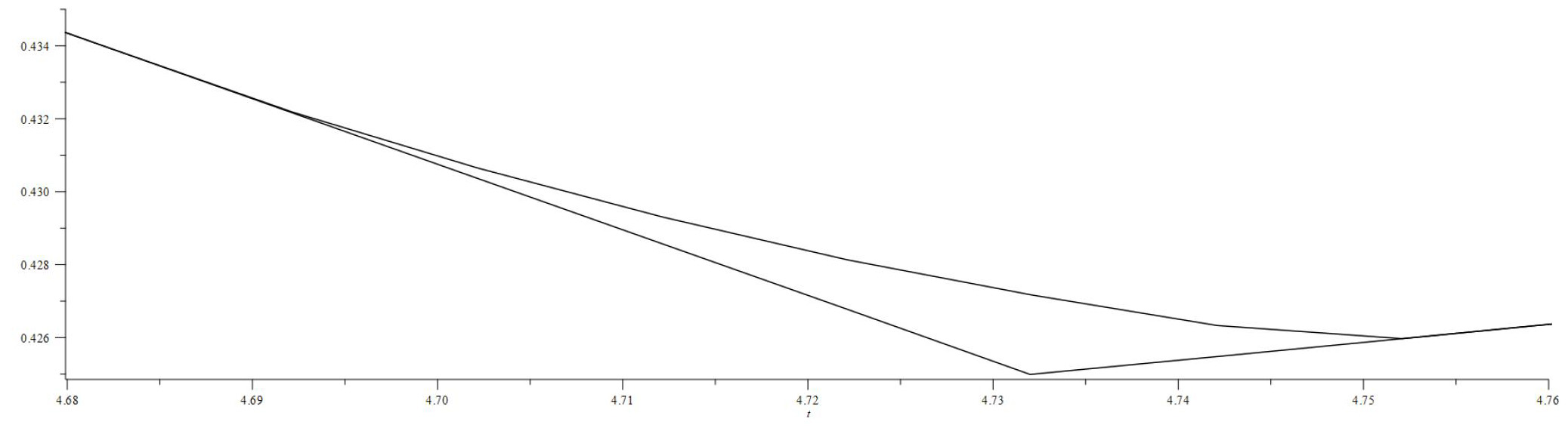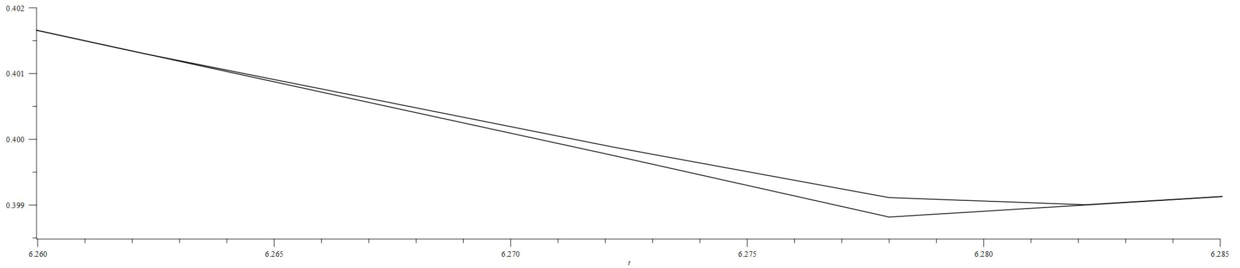 Как и в случае весьма скромными вычислениями получено очень хорошее приближение при В случае функций с действительными коэффициентами результаты аналогичны. Отличие между кривыми в случае действительных и комплексных коэффициентов показано крупным планом в масштабе 1:1 на рисунке 2. Расчеты для функций с действительными коэффициентами проведены с разбиением 0.01 по В этом разбиении по t — 479 точек, по — 101 точка, а по — 201 точка.