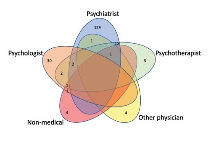 A total of 197 responses from medical professionals were collected. A Venn diagram showing the participants’ distribution in terms of specialties is presented in Figure 1. Some specialists had two or more work positions (i.e., psychiatrist and psychotherapist, or psychiatrist, psychotherapist, and physician), each specialty was considered unique. Thus, the sum of all specialties exceeded n = 197. Altogether, 148 defined themselves as psychiatrists, 36 as psychologists, 26 as psychotherapists, 6 as other physicians, and 7 as non-medical specialists.