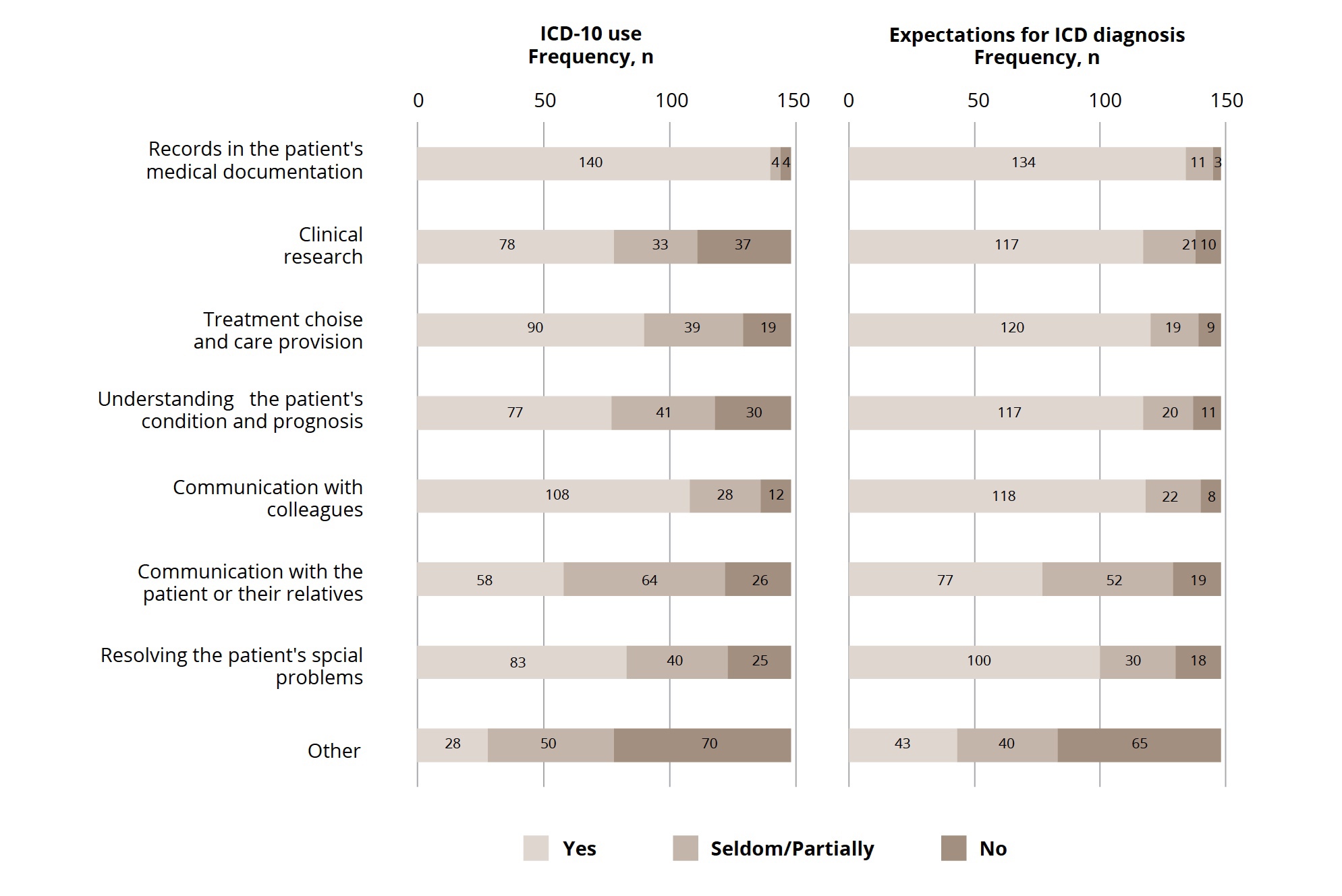 ICD-10 was most frequently used for a patient’s medical record (n = 140, 94.6%), followed by communication with colleagues (n = 108, 72.97%), treatment choice and care provision (n = 90, 60.81%), resolving the patient’s social problems (n = 83, 56.08%), clinical research (n = 78, 52.70%), understanding the patient’s condition and prognosis (n = 77, 52.03%), communication with patients and their relatives (n = 58, 39.19%), and other reasons (n = 28, 18.92%; Figure 3).