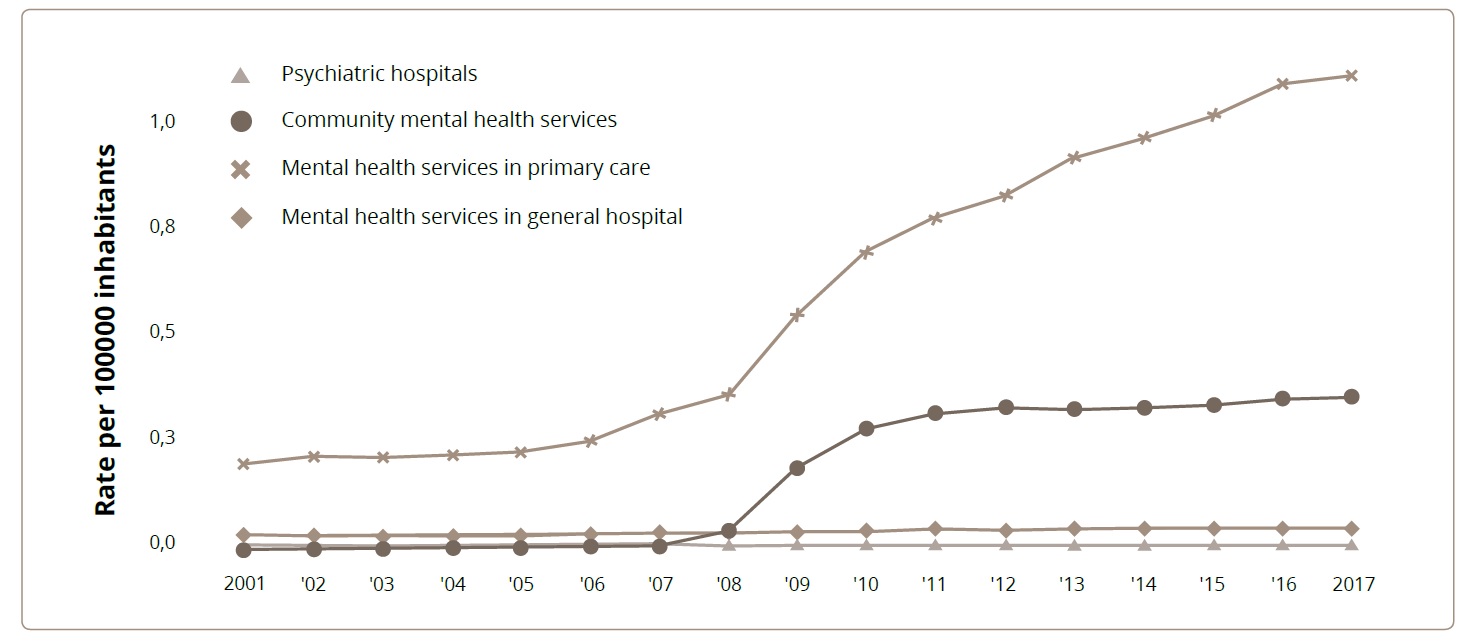 Trends in mental health services can be observed within the units run by the Ministry of Health. Data show a sustained increase in primary health units with mental health services (rising from 0.2 per 100,000 inhabitants in 2001, to 1.1 per 100,000 inhabitants in 2017). Since 2008, there has also been an increase in mental health community services (from 0.1 per 100,000 inhabitants in 2008 to 0.4 per 100,000 inhabitants in 2017) (Figure 1).