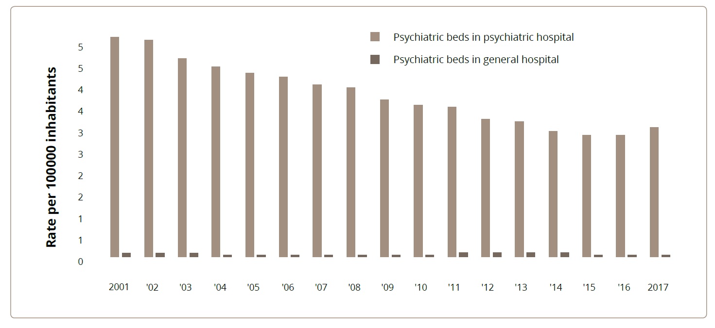 The number of psychiatric hospitals has remained stable (with 0.03 hospitals per 100,000 inhabitants). Although the number of beds in psychiatric hospitals decreased from 5.07 to 2.98 per 100,000 inhabitants, psychiatric beds in general hospitals did not increase (Figure 2).