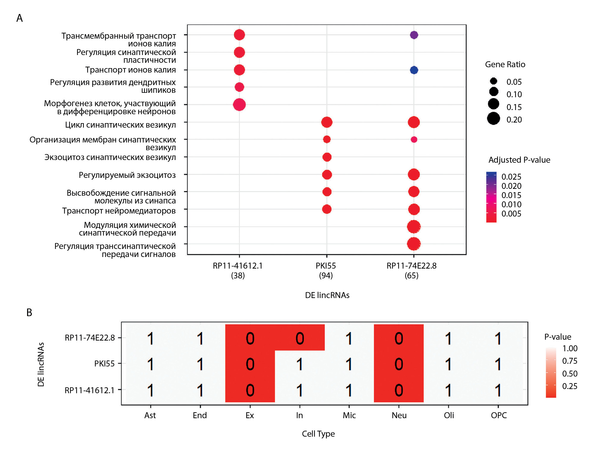 Далее была выполнена оценка ассоциаций мРНК, являющихся мишенями DEL, с восемью основными типами клеток головного мозга, посредством их тестирования с использованием индивидуального списка маркерных генов, основанного на опубликованных данных. Анализ выявил очевидную и значимую связь между мишенями всех трех DEL и общими нейрональными маркерами, а также маркерами возбуждающих нейронов (рис. 5B). Эти данные согласуются с результатом функциональной аннотации, в котором преобладают показатели функциональной активности нейронов. Кроме того, мишени RP11-74E22.8 значимо перекрываются с маркерами ингибирующих нейронов, что может быть связано с их обогащением в ГАМК-ергических, дофаминергических и норадреналиновых путях. Данные результаты предполагают, что три DEL могут модулировать сеть генов, экспрессируемых в нейронах и принимающих участие в синаптической передаче сигналов.