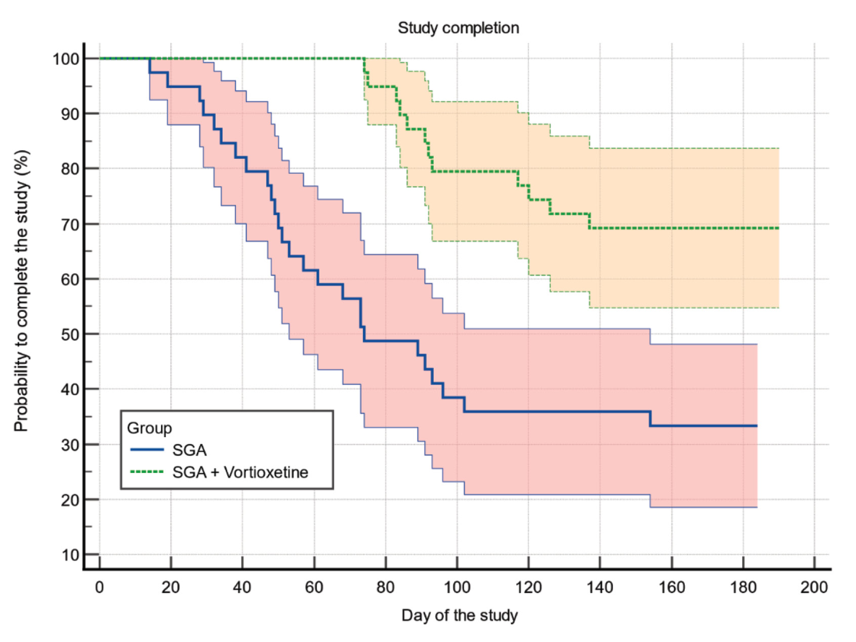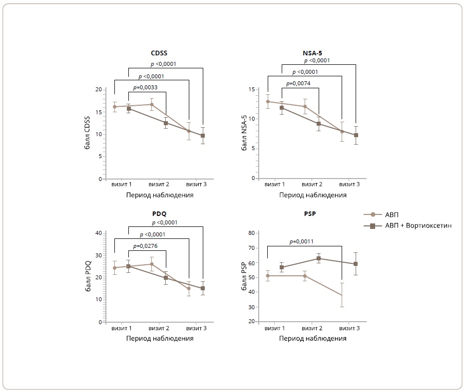 РЕЗУЛЬТАТЫ: Данные проведенного теста ANOVA свидетельствуют, что вне зависимости от терапевтической группы у пациентов к завершению периода наблюдения отмечались статистически значимое снижение уровня депрессии по шкале CDSS, выраженности негативных симптомов по шкале NSA-5, когнитивных симптомов по шкале PDQ-20, а также улучшение личностного и социального функционирования — повышение итогового балла шкалы PSP. Вместе с тем, между сравниваемыми основной (АВП + вортиоксетин) и контрольной (АВП) группами выявлены статистически значимые различия по динамике суммарного балла по шкалам CDSS и PSP. Особенностью динамики показателей клинических шкал стало наличие заметного улучшения в группе АВП + вортиоксетин через 3 месяца лечения при отсутствии аналогичного улучшения в группе контроля и достижение примерно одинаковых значений шкал в обеих группах через 6 месяцев. В частности, через 3 месяца между группами АВП + вортиоксетин и АВП имелись статистически значимые различия средних значений шкал CDSS (p <0,001), NSA-5 (p=0,003), PDQ-20 (p <0,001) и PSP (p=0,004). Анализ времени до преждевременного завершения исследования продемонстрировал, что в группе АВП + вортиоксетин статистически значимо больше пациентов полностью завершили программу исследования (n=27, 69,23%) по сравнению с группой АВП (n=13, 33,33%) (χ2 = 14,618, df = 1, p <0,001, лог-ранк текст). Коэффициент выживаемости (коэффициент времени, в течение которого пациент продолжает назначенную терапию) в исследовании в группе АВП было статистически значимо (p <0,001) меньше и составило 101, 436 дня (95% ДИ: 81 518–121 354), а в группе АВП + вортиоксетин — 161 744 дня (147 981–175 506). Показатель относительного риска для полного завершения исследования в группе вортиоксетин + АВП по сравнению с АВП составил 3618 (1871–6994).