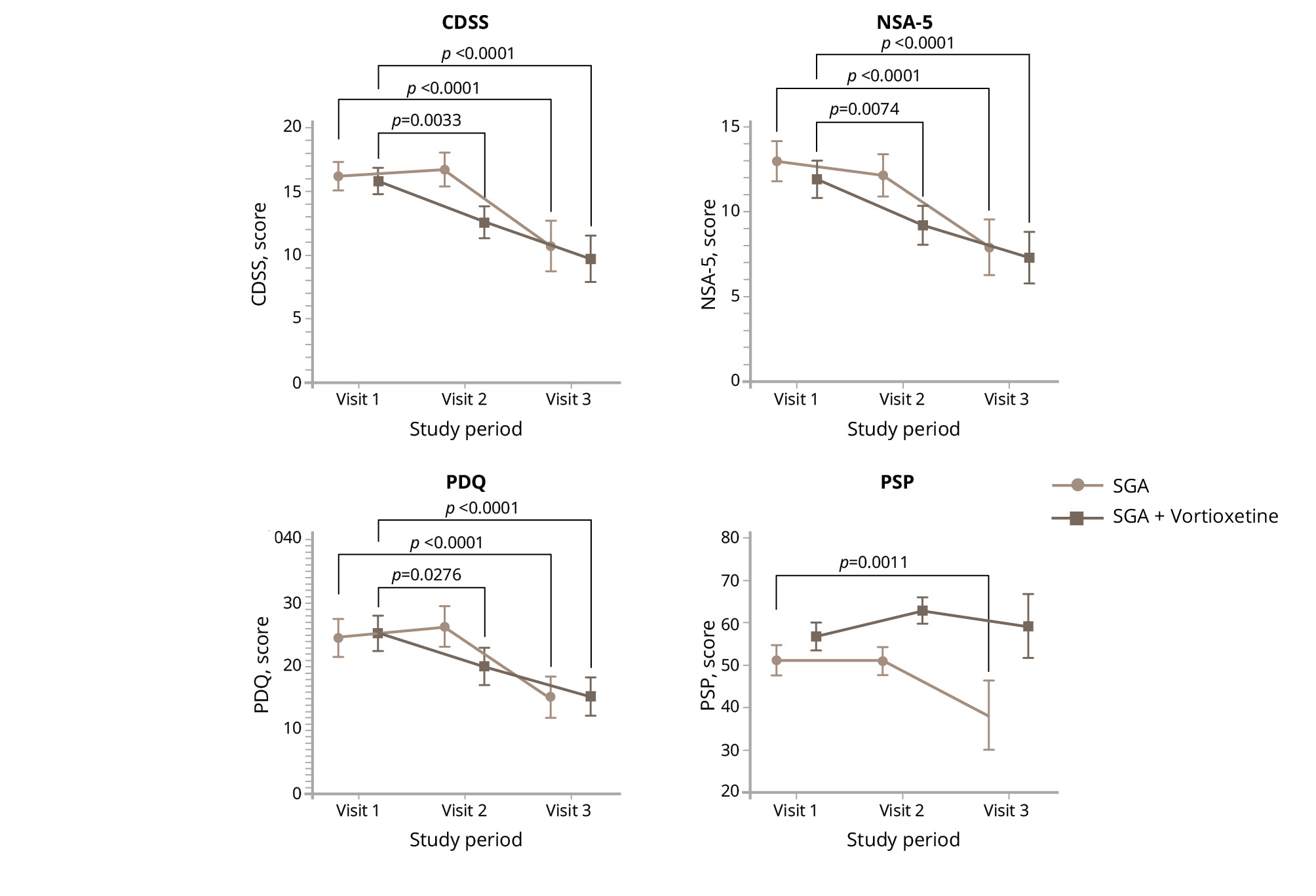 ЦЕЛЬ: Изучение динамики клинических проявлений депрессии, негативных и когнитивных нарушений, а также социального функционирования пациентов на фоне комбинированной терапии АВП и вортиоксетином, которые назначались в условиях реальной клинической практики в разрешенных в Российской Федерации дозах.