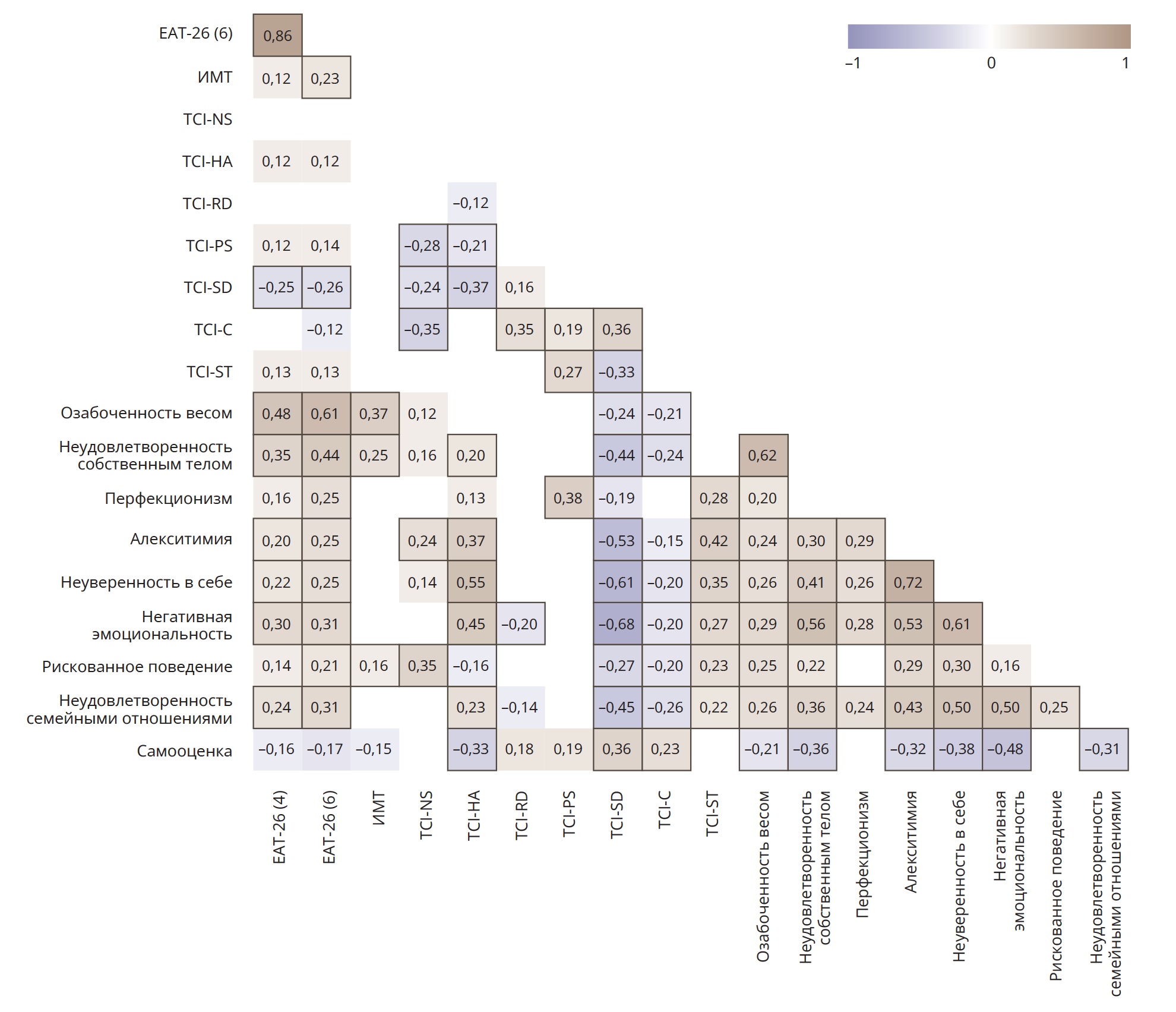 Для оценки того, как связаны между собой суммарный балл EAT-26, ИМТ, оценки по шкалам TCI-R и RFED, а также характеристики самооценки, использовался корреляционный анализ Спирмена.