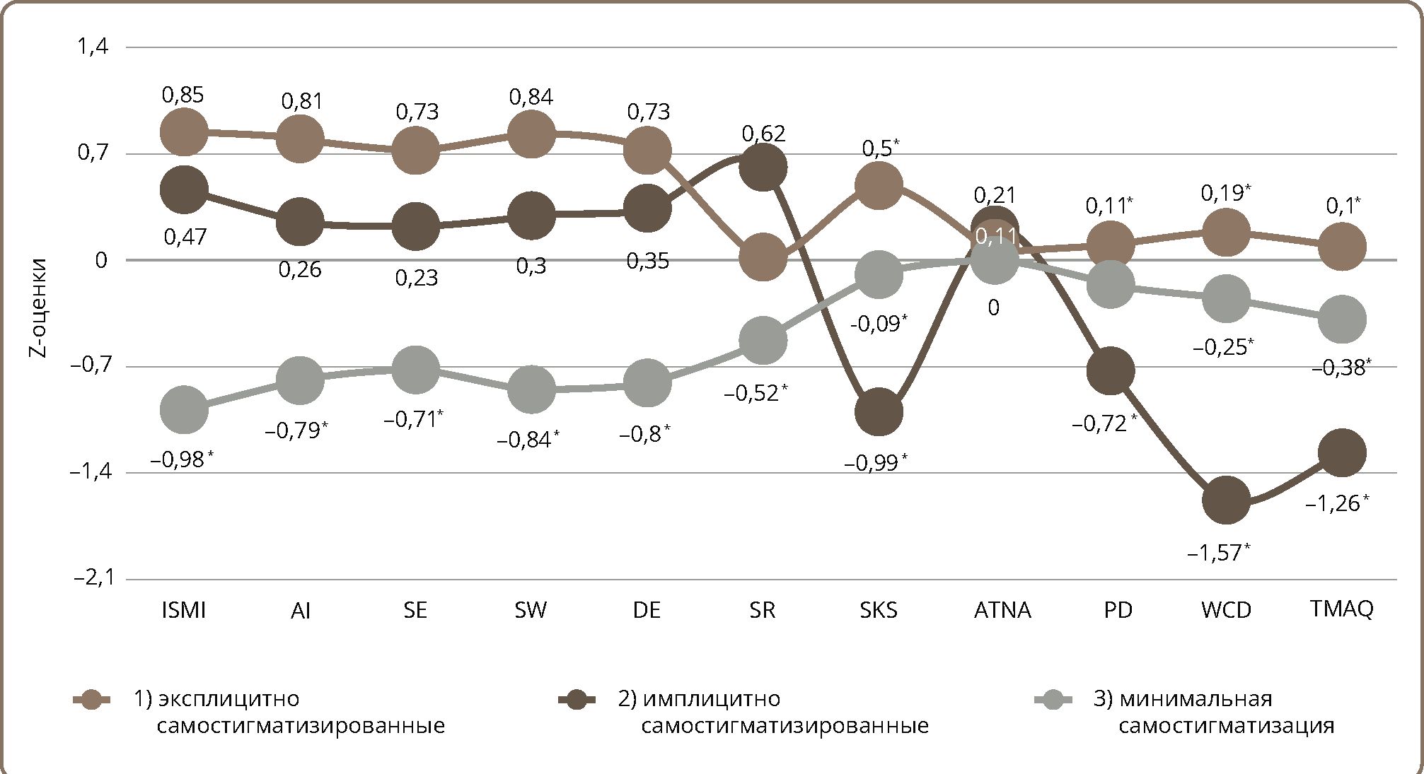 У 20 пациентов из 2-го кластера (32% выборки) был выше уровень самостигматизации (dif=0,71, SE=0,09, sig <0,001) по сравнению с пациентами из 3-го кластера за счет более низкого уровня устойчивости к самостигматизации (dif=–0,71, SE=0,17, sig <0,001). Подтип стигмы у пациентов 2-го кластера мы определили как «имплицитную» стигму.